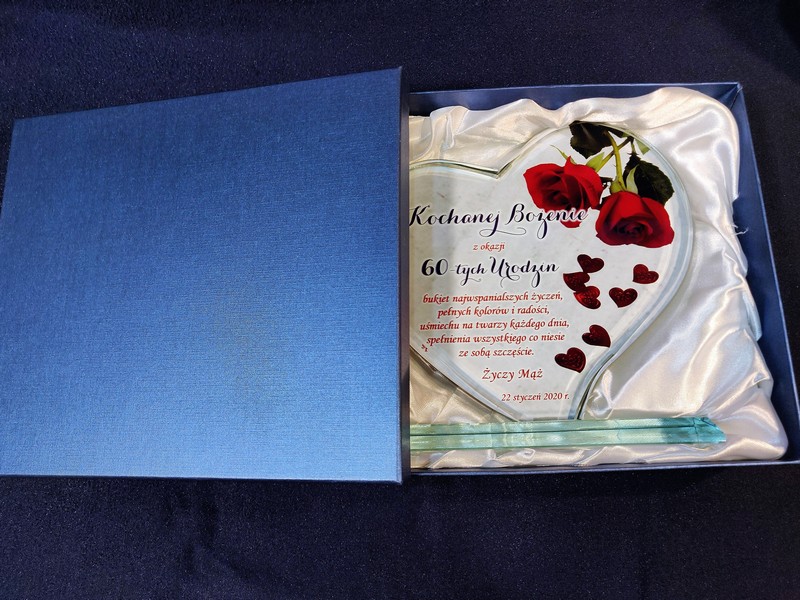 Upominek urodzinowy w postaci statuetki szklanej G041 w kształcie serca z nadrukiem dedykacji.