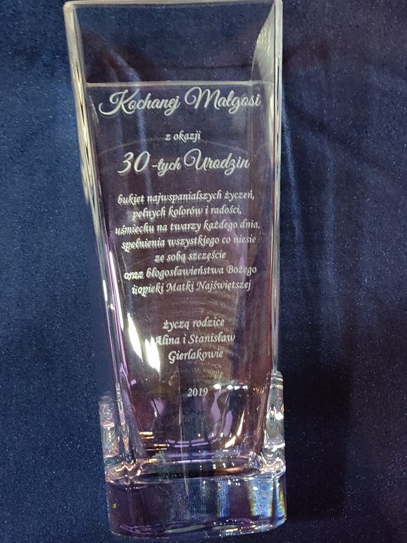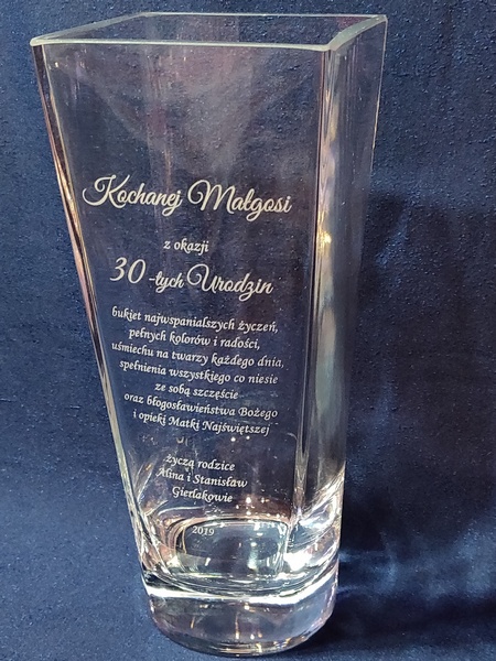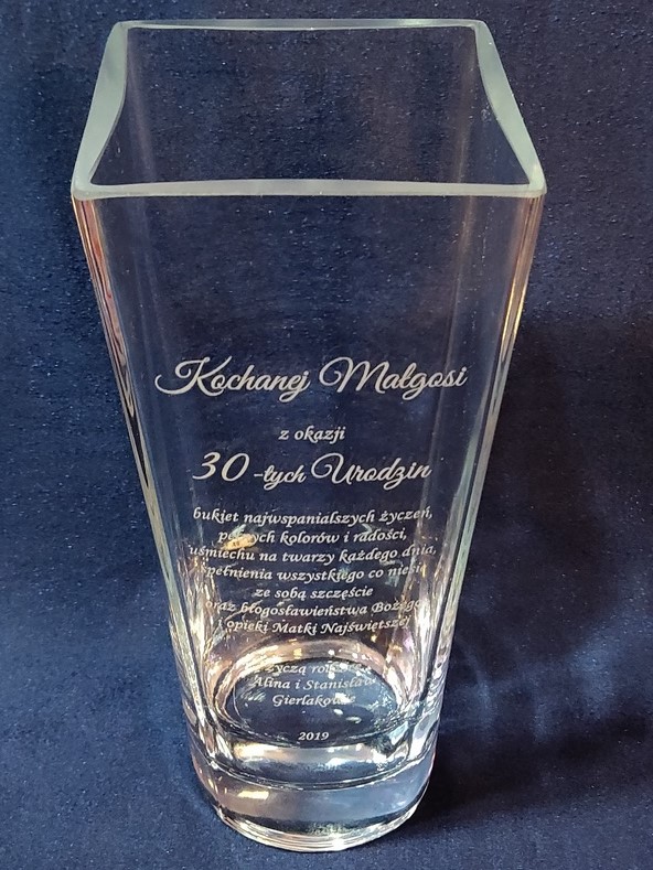 Na wazonie wykonany jest grawer ozdobnych grafik i dedykacji dla Jubilata.