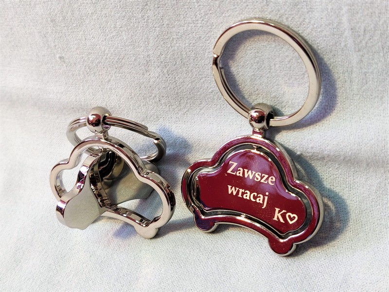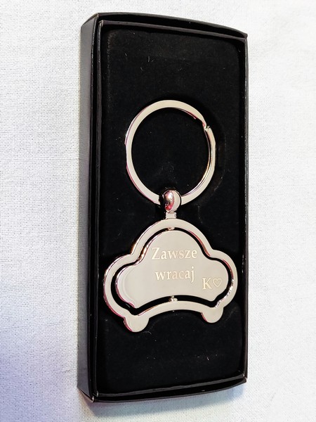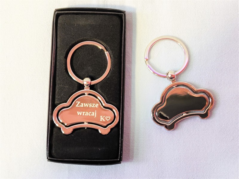 Upominek dla Niej lub upominek dla Niego w postaci metalowego breloczka w kształcie auta z grawerem dedykacji.