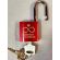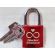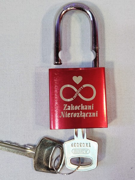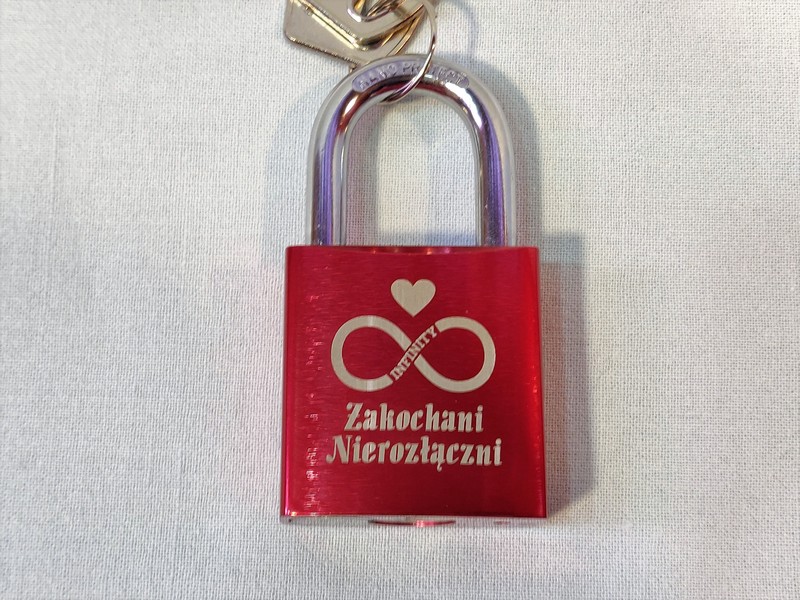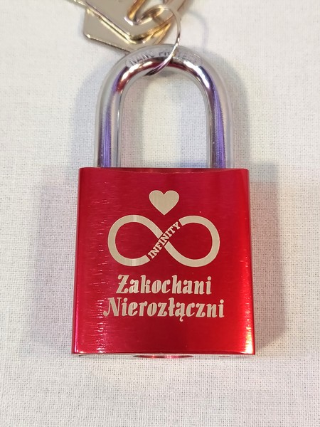 Upominek dla zakochanych w postaci czerwonej kłódki z grawerem dedykacji, serduszka i symbolu nieskończoności.
