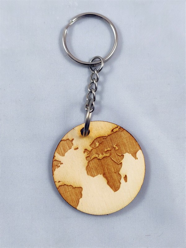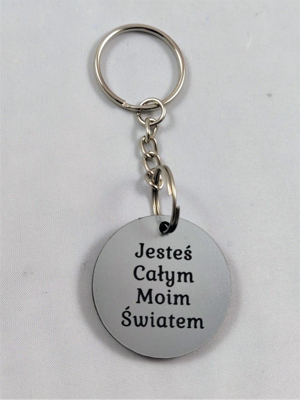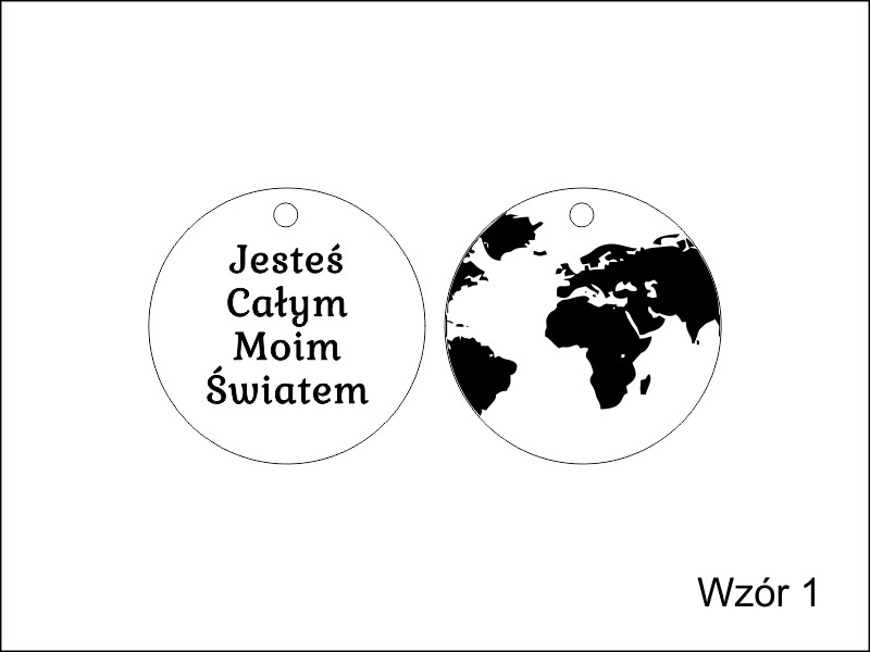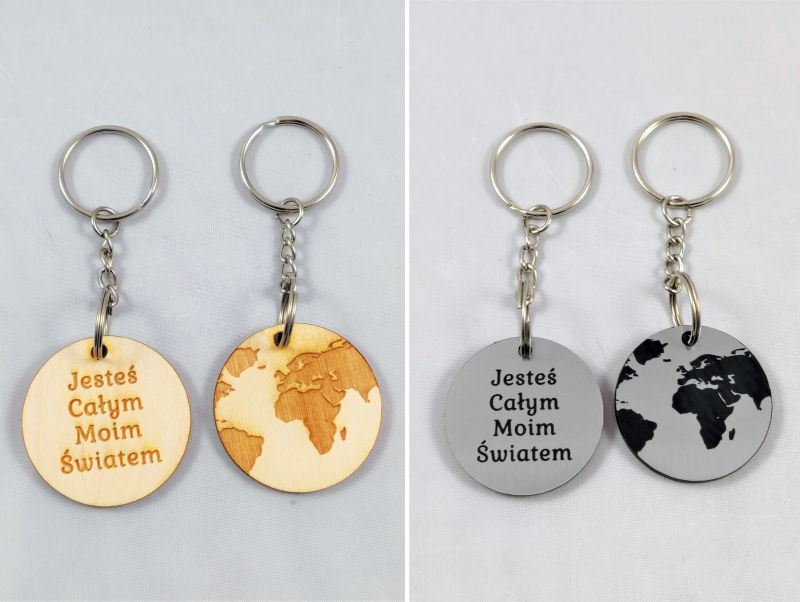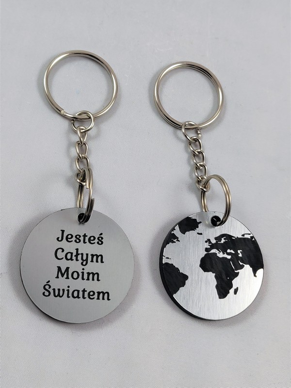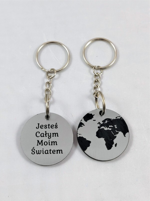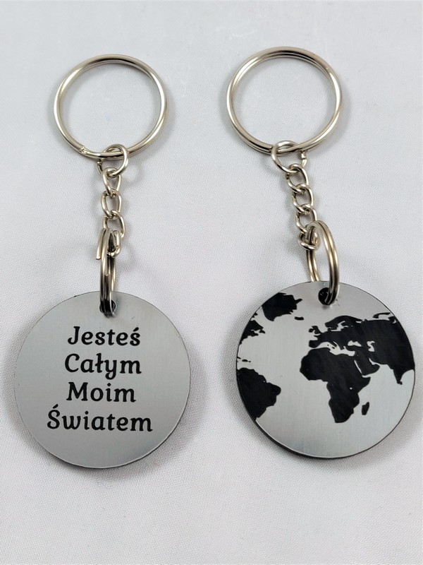 Z jednej strony breloczka wykonany jest grawer zarysu kontynentów, przedstawiający kulę ziemską, a z drugiej strony wykonany jest grawer dedykacji "Jesteś całym moim światem".