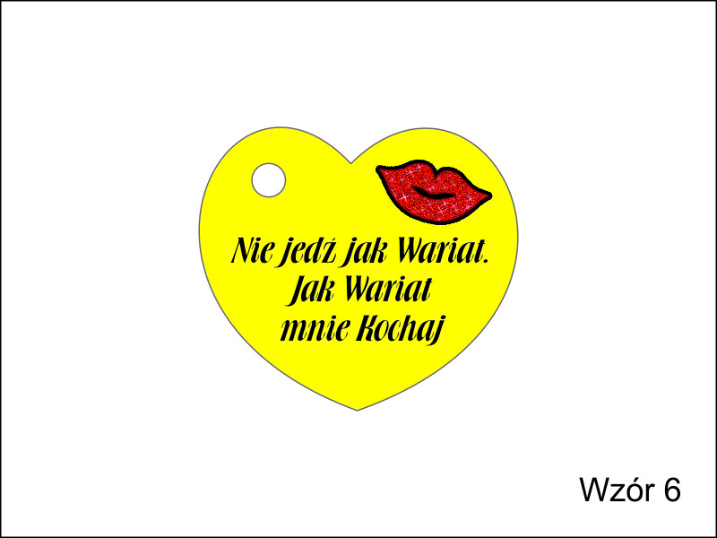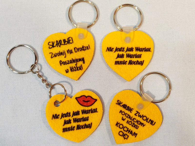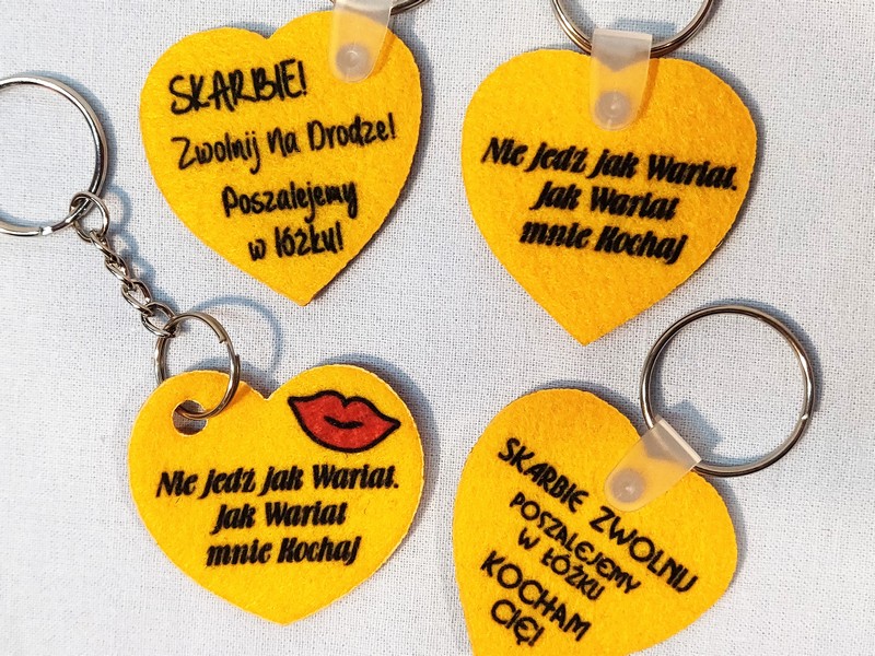 Brelok ma kształt wyciętego z filcu serca, na którym wykonany jest nadruk dedykacji.