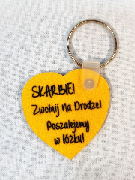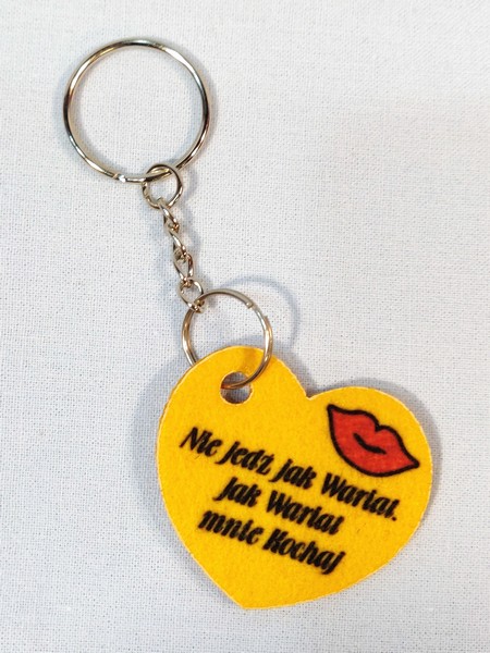 Upominek dla zakochanych w formie breloczka z żółtego filcu w kształcie serca z nadrukiem dedykacji.