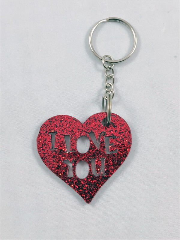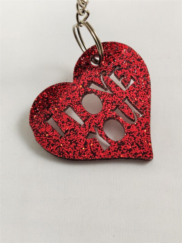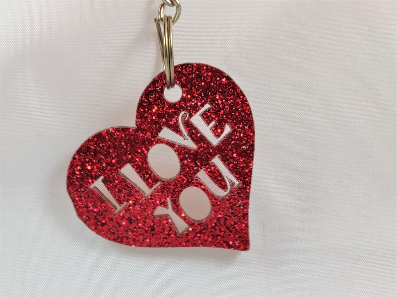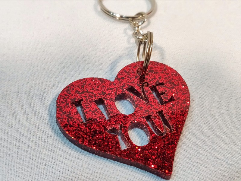 Upominek dla zakochanych w formie breloczka w kształcie serca wyciętego z brokatowj czerwonej pleksy.