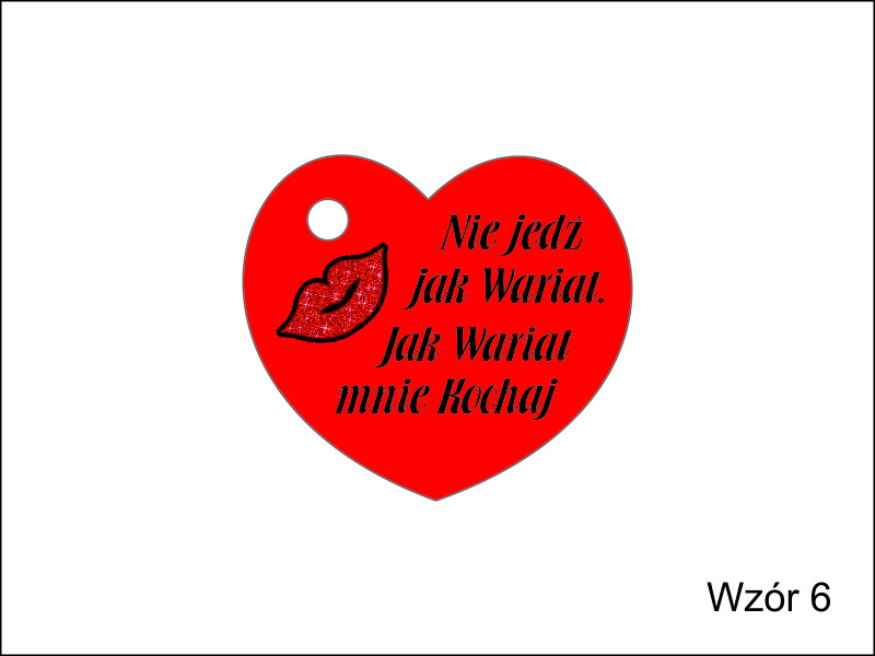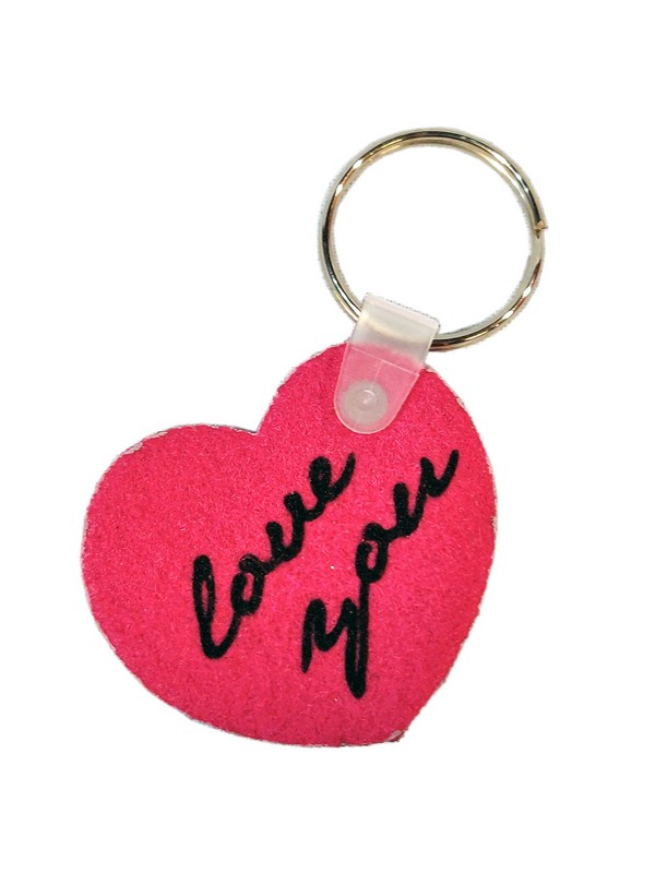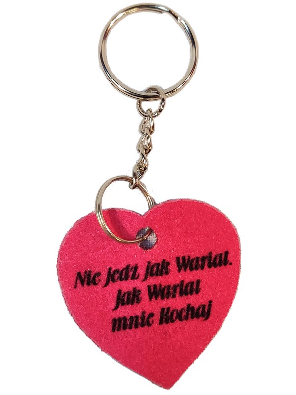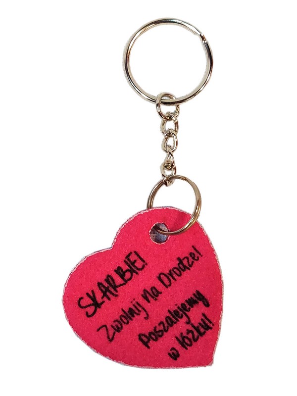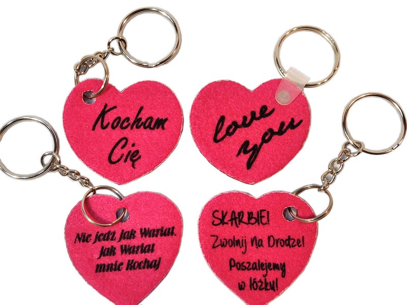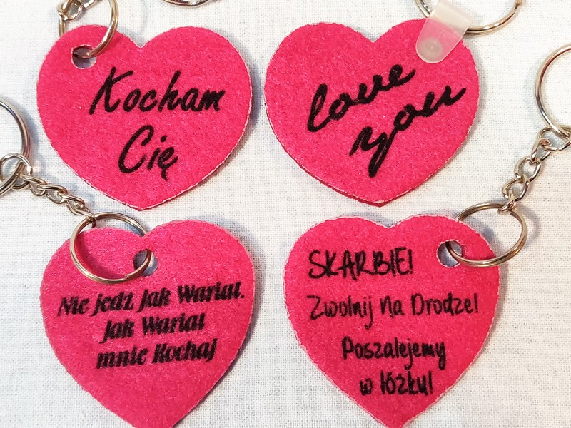 Brelok ma kształt wyciętego z filcu serca, na którym wykonany jest nadruk dedykacji.