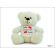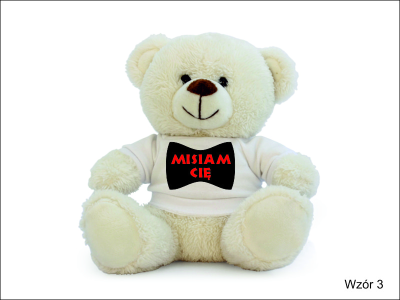 Miś z pluszu ma kremowy kolor i ubrany jest w białą koszulkę do nadruku.