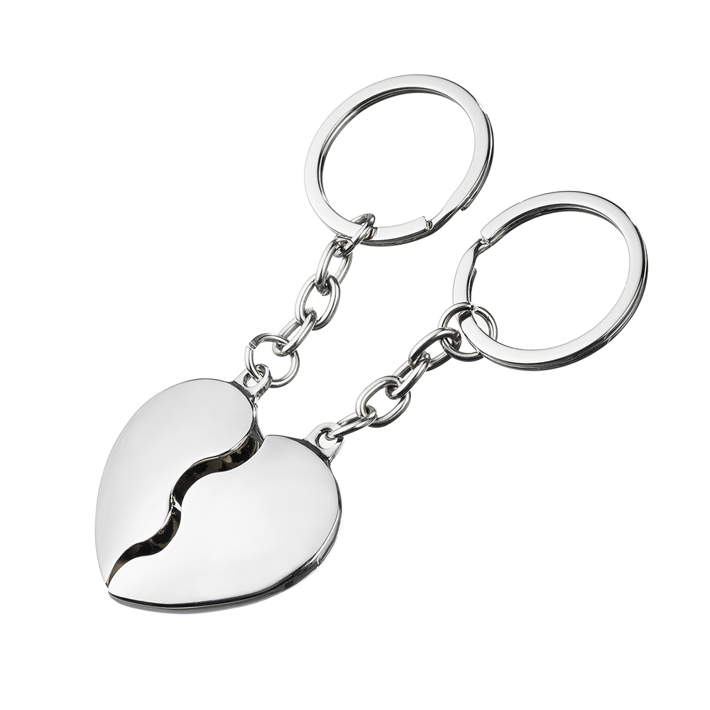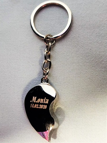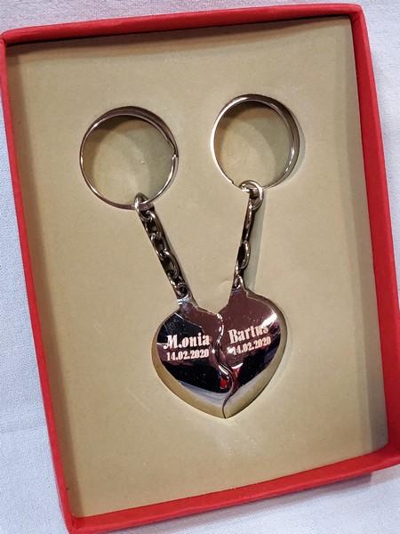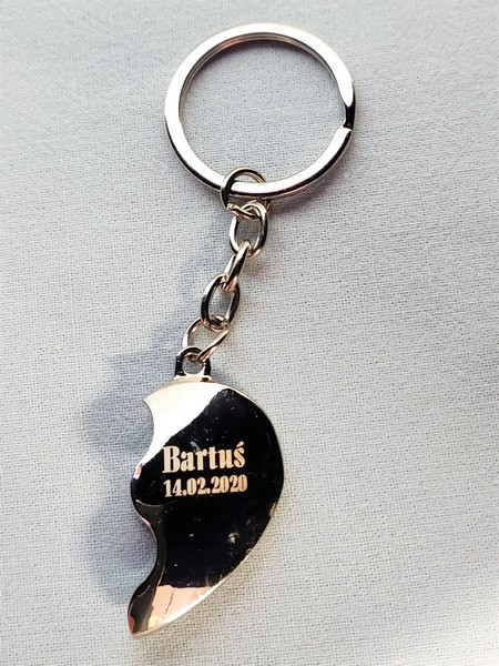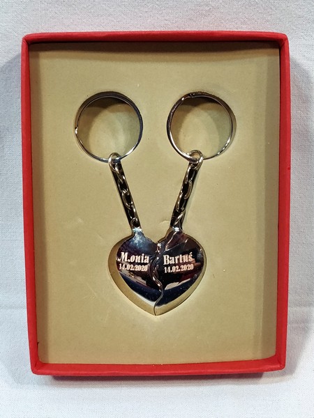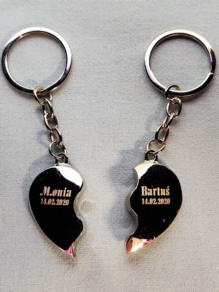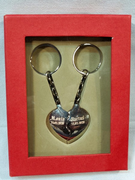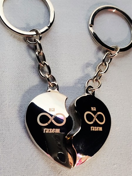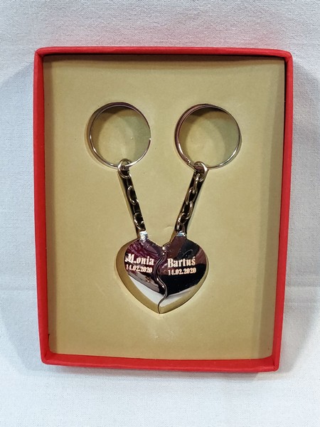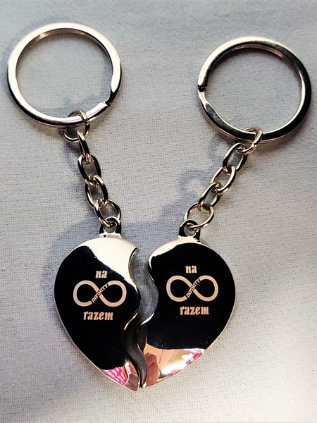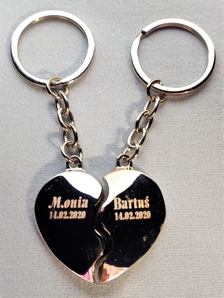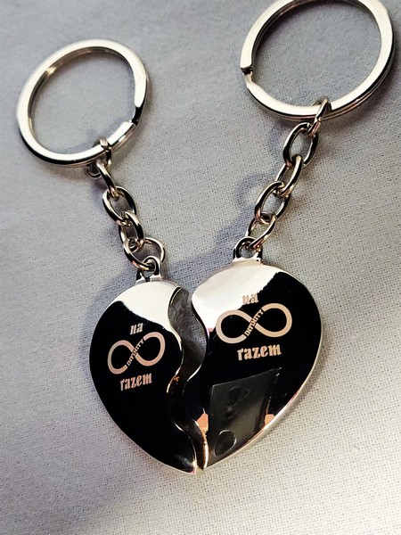 Prezent dla zakochanych w postaci metalowego zestawu breloków "Połówki Serca" z grawerem dedykacji.