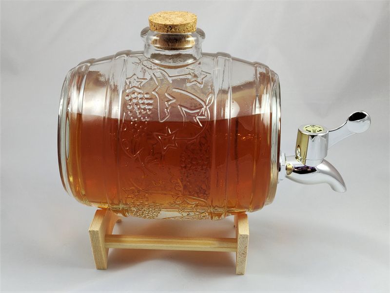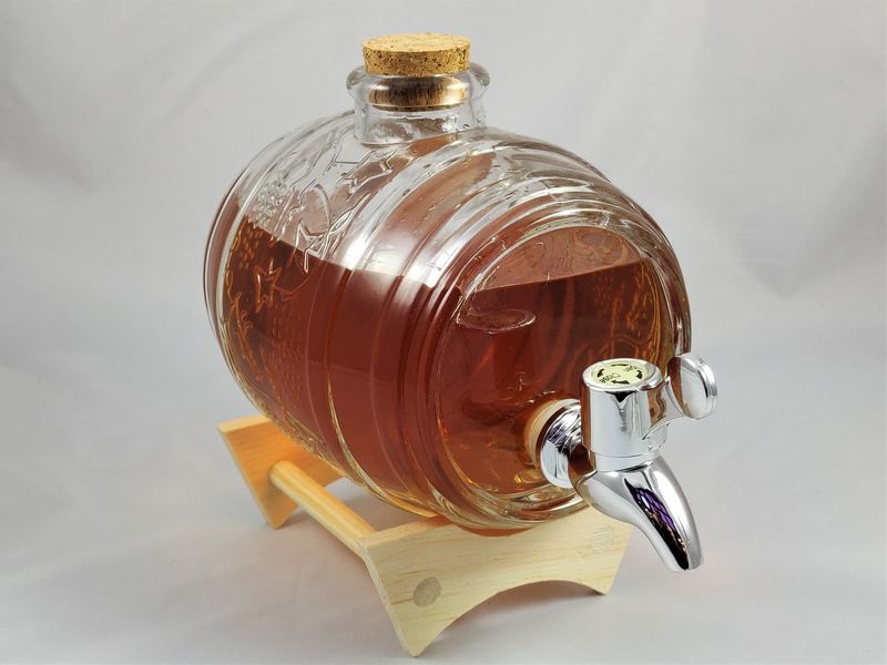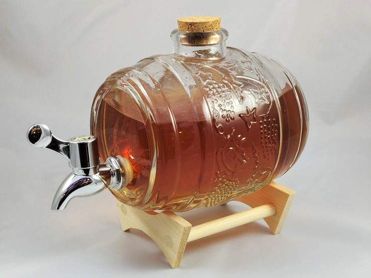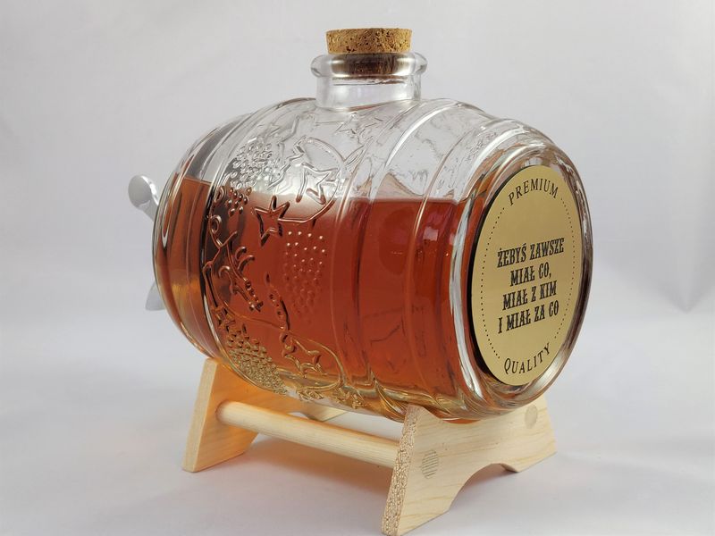 Szklana beczka z kranikiem o pojemności 1 litra to wyjątkowa w kształcie karafka na różne trunki.
