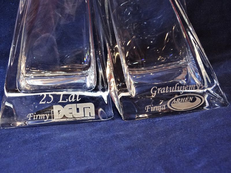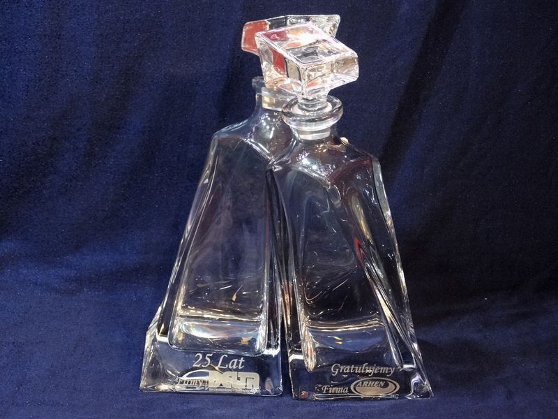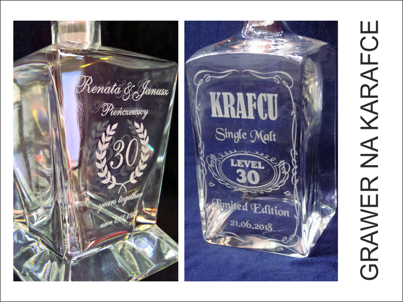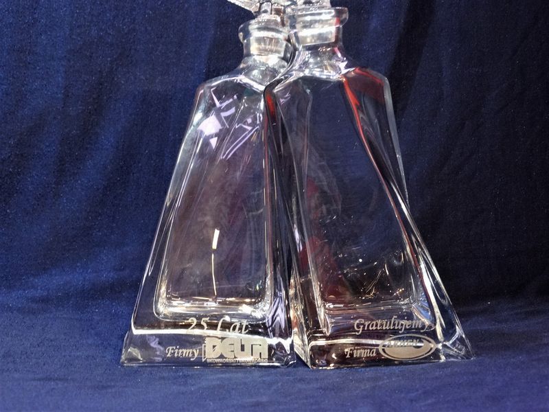 Na powierzchni karafek wykonujemy grawer według uzgodnionego wcześniej projektu: dowolnej dedykacji, ozdobników, loga czy zdjęcia.