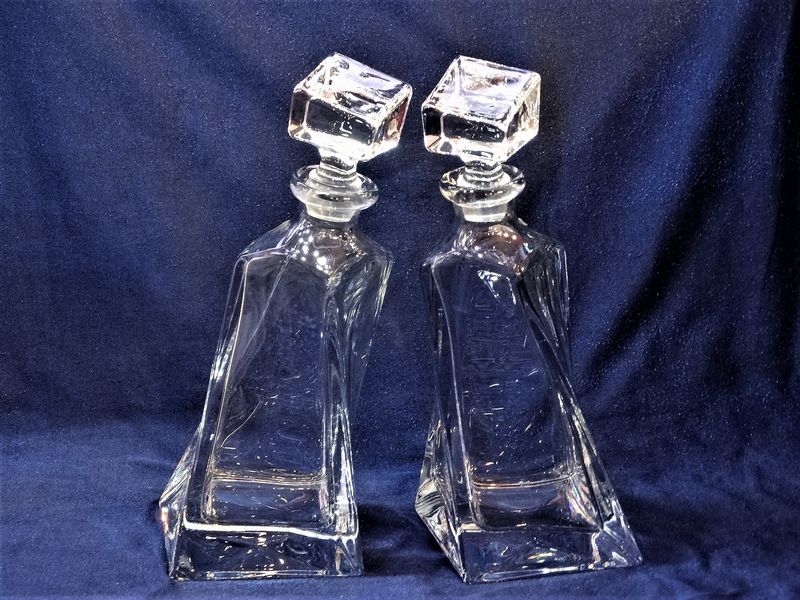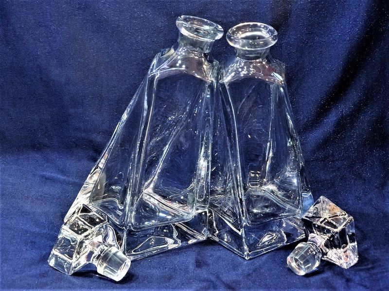 W zestawie znajdziemy dwie karafki o kształcie lekko skręconym (wygiętym),