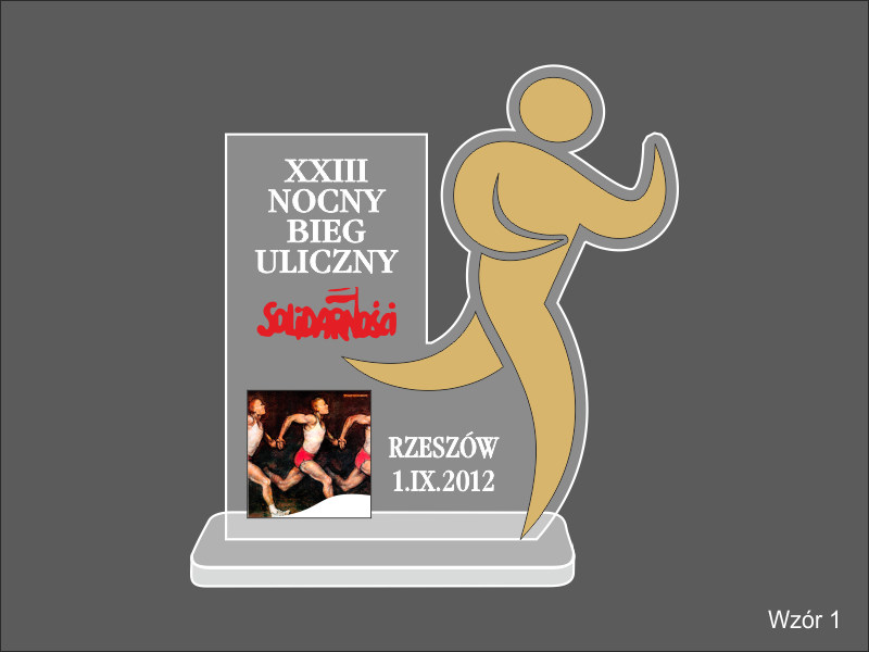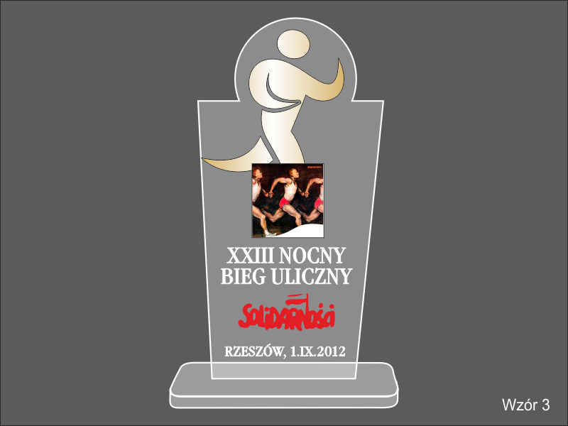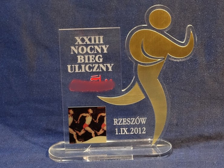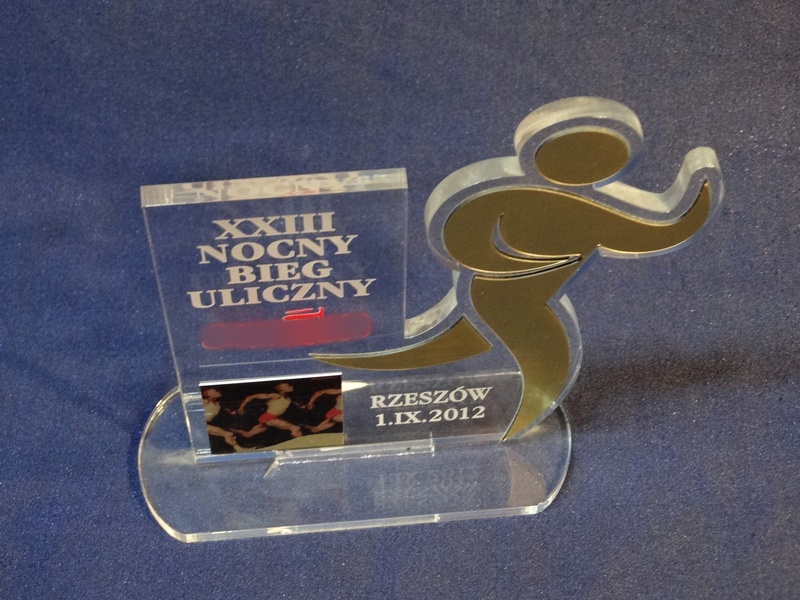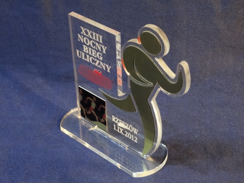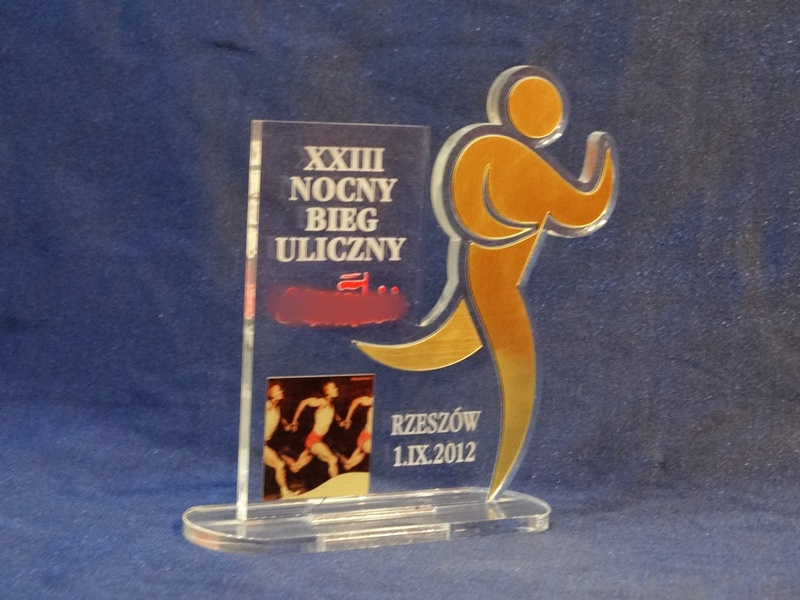 Statuetka Biegi wykonana z pleksi i laminatu z grawerem oraz nadrukiem dedykacji, logotypu, emblematu i ozdobnych grafik.