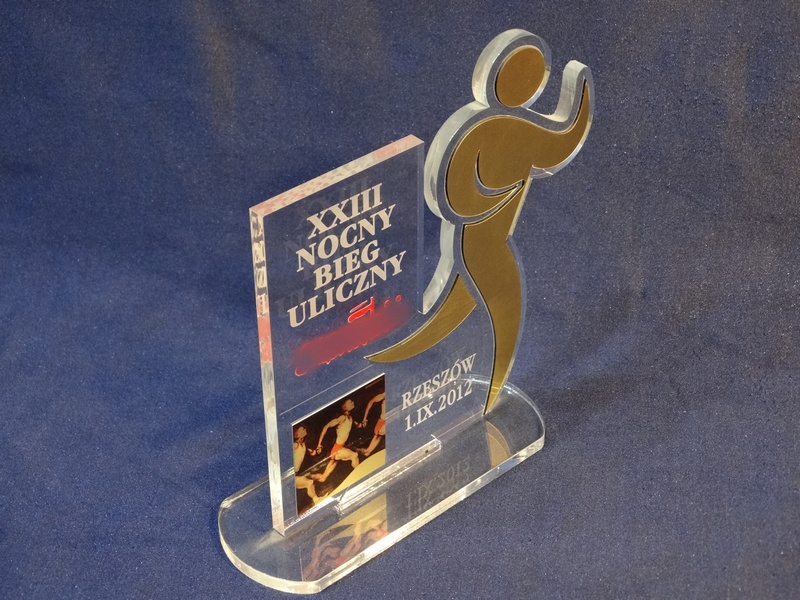 Sylwetka biegacza jest wycięta z laminatu, dedykacja grawerowana, a logotypy nadrukowane na blaszce.