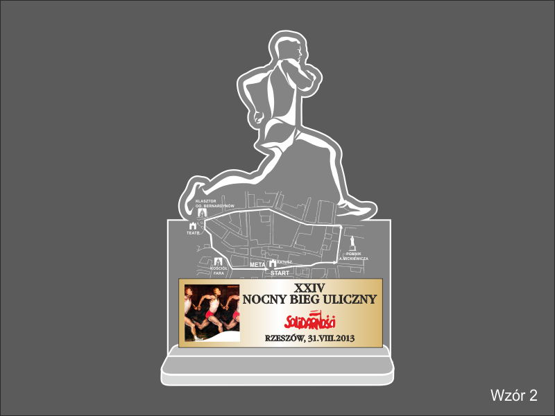 W projekcie statuetki wykorzystano kształt biegacza oraz plan trasy biegu.
