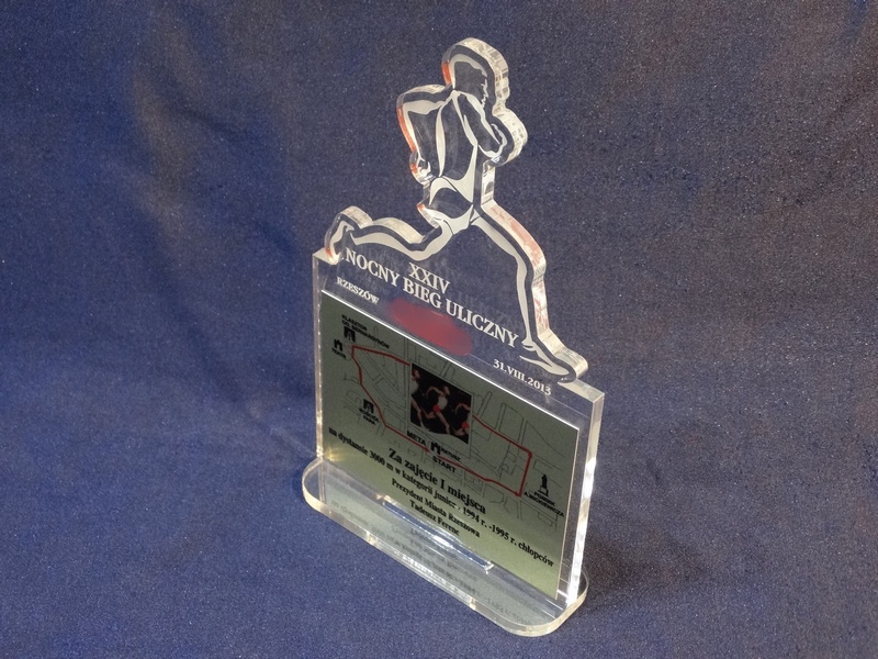 Sylwetka biegacza jest grawerowana, a trasa, logotyp i dedykacja nadrukowana na blaszce.