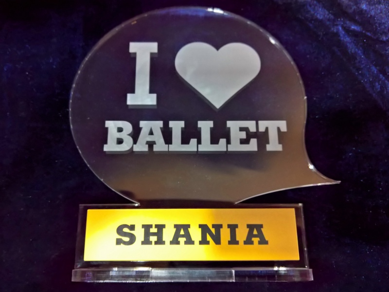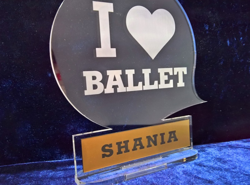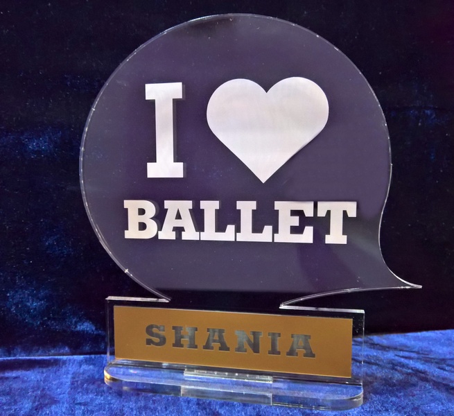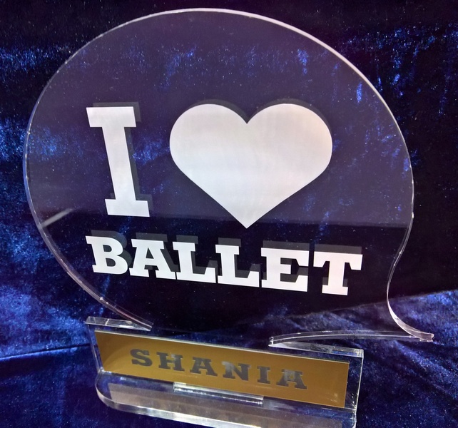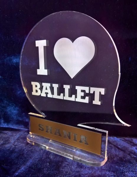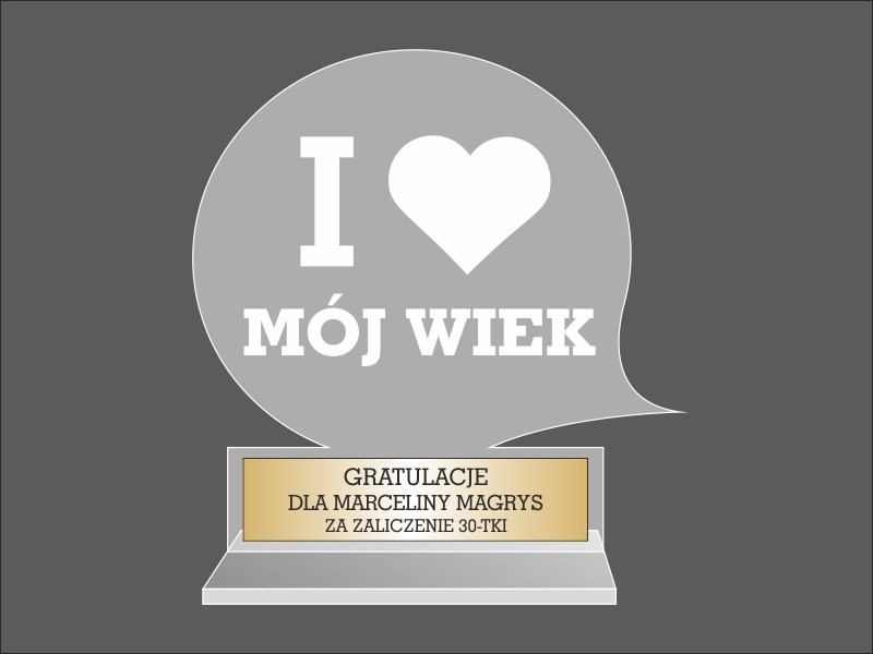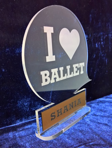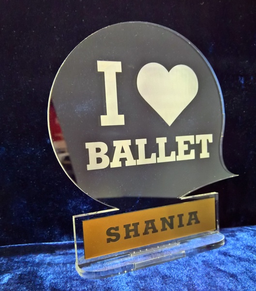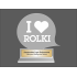 Statuetka "I LOVE" wykonana z bezbarwnej pleksi i złotego laminatu, z grawerem dedykacji i ozdobnych grafik.