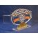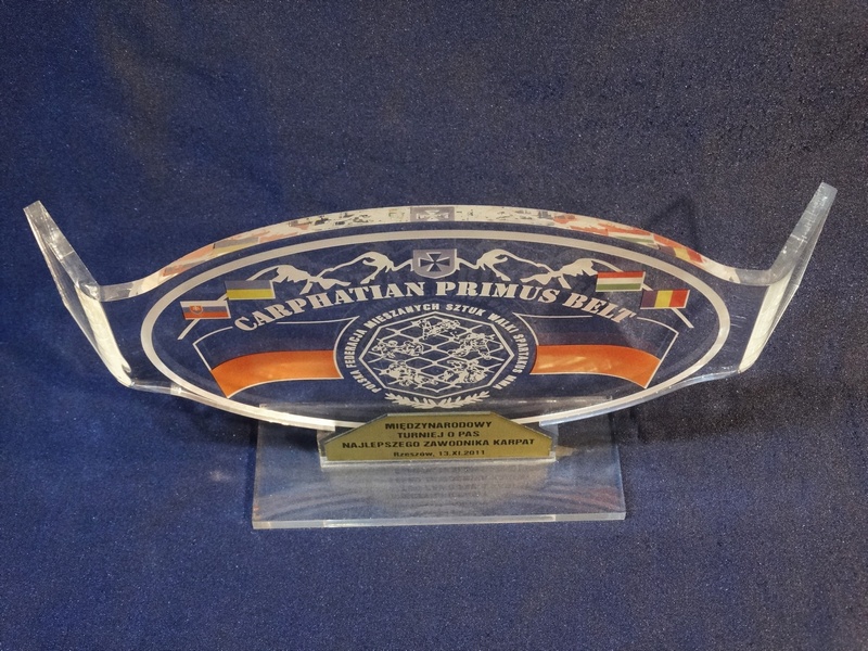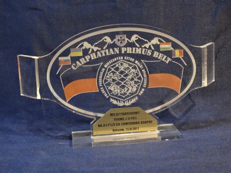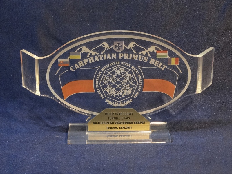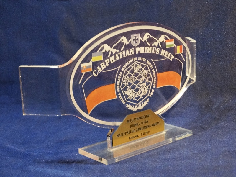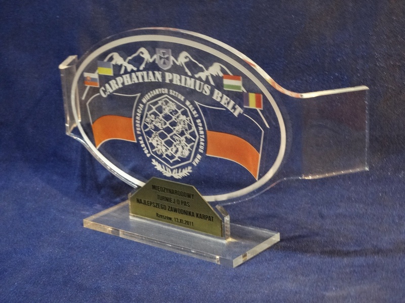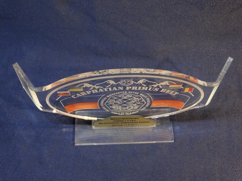 Statuetka "Pas Mistrzowski" wykonana z bezbarwnej pleksi z grawerem i nadrukiem dedykacji, logotypu, emblematu i ozdobnych grafik.