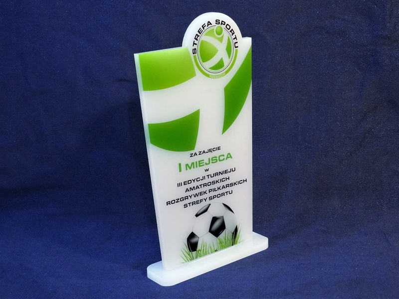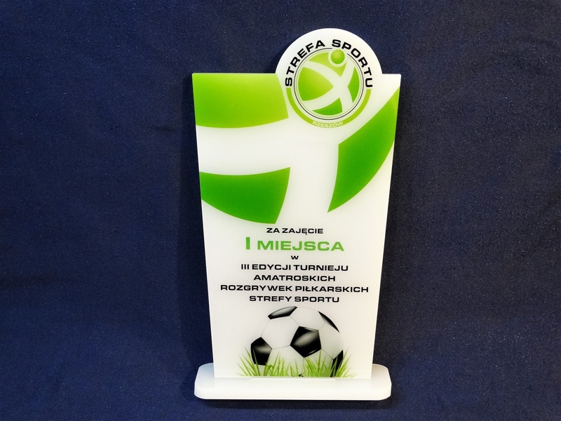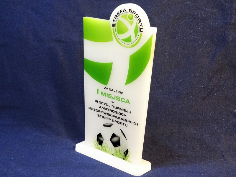 Statuetka Piłka Nożna wykonana z białej pleksi z nadrukiem dedykacji i ozdobnych grafik.
