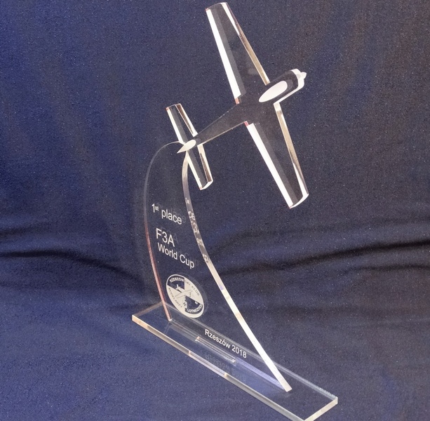 Statuetka Samolot wykonana z bezbarwnej pleksi z grawerem dedykacji, logotypu, emblematu i ozdobnych grafik.