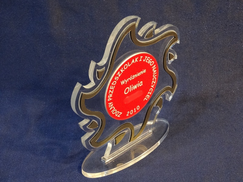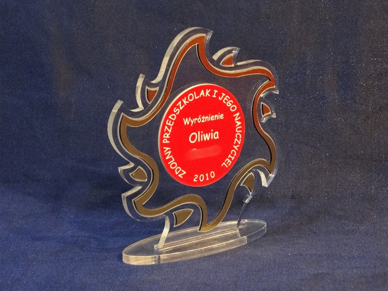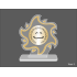 Statuetka "Słoneczko" wykonana z bezbarwnej pleksi i laminatu z grawerem dedykacji, logotypu, emblematu i grafik.