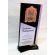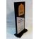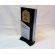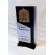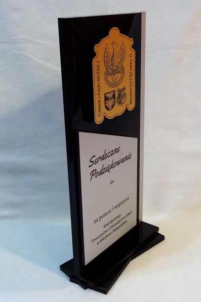 Złożona statuetka wykonana z czarnej pleksi i laminatów, z grawerem dedykacji i ozdobnych grafik.
