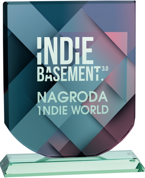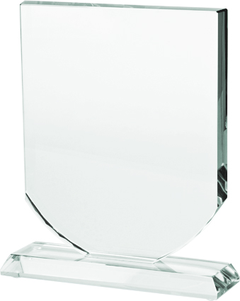 Statuetka szklana ma kształt tarczy i szlifowaną krawędź.