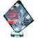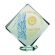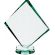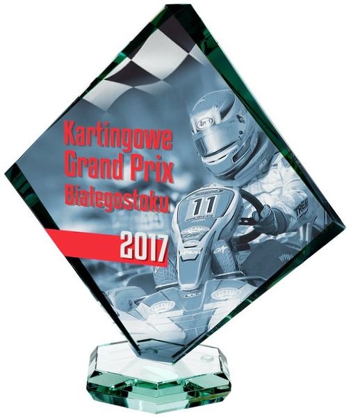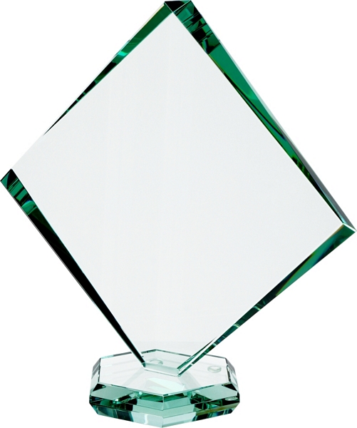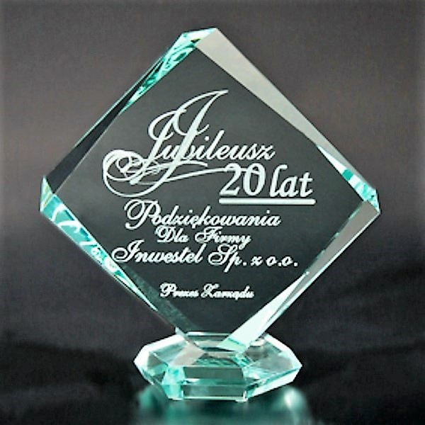 Statuetka szklana ma kształt obróconego rombu oraz szlifowane krawędzie.