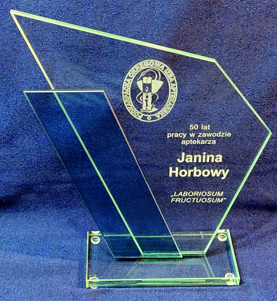 Tafla szklana statuetki ma na krawędziach wykonany szlif.