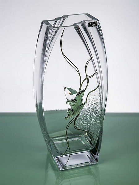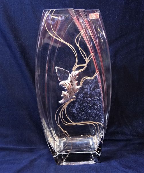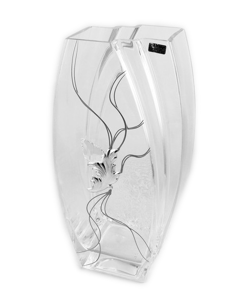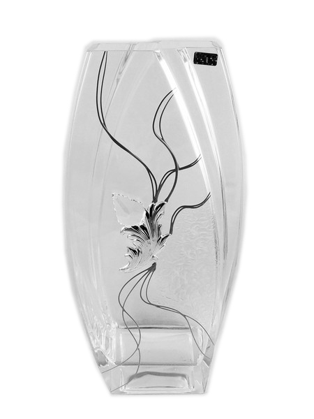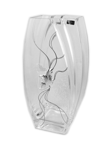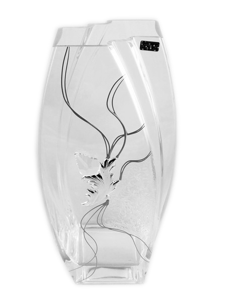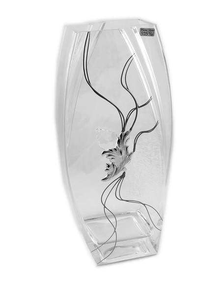 Wazon ozdobiony jest umieszczonym centralnie efektownym kryształkiem, połączonym ze srebrnym liściem oraz przezroczystym motywem roślinnym, który wygląda jak zatopiony i malowany na szkle.