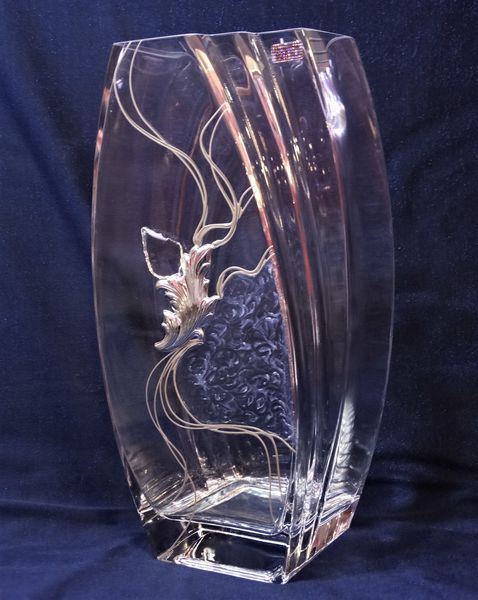 Wazon szklany Alicja zdobiony kryształem i srebrnym liściem z grawerem dedykacji.