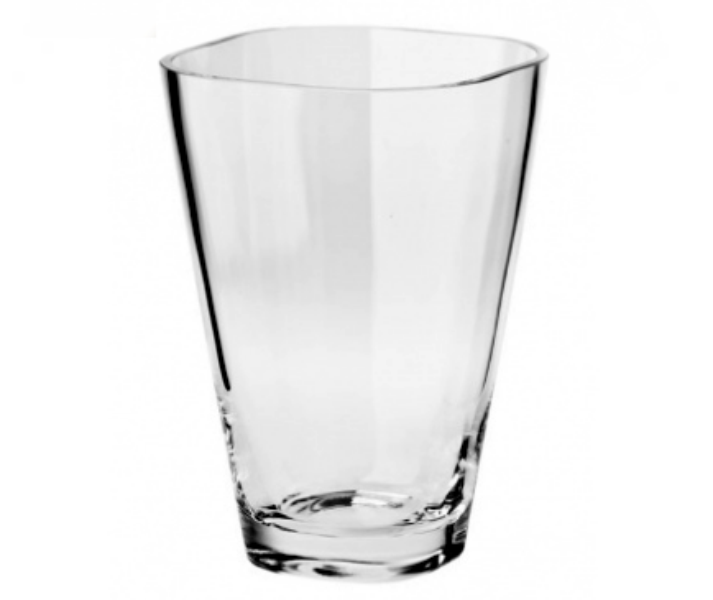 Wazon w trapezowatym rozszerzającym się ku górze kształcie, o kwadratowej podstawie z łukowatymi zaoblonymi krawędziami.