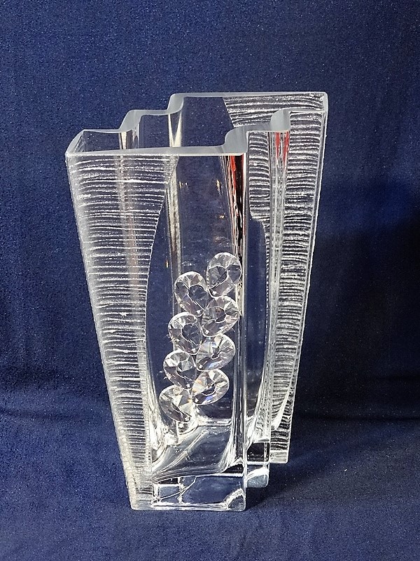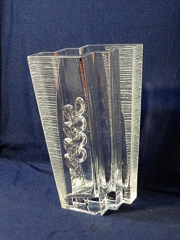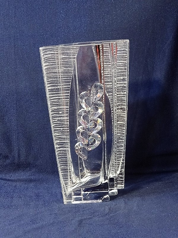 Niepowtarzalny, ręcznie formowany, zdobiony wazon szklany w prostokątnym kształcie z bocznymi schodkami.
