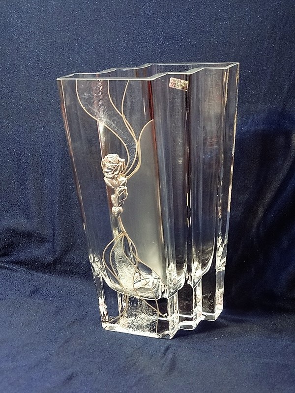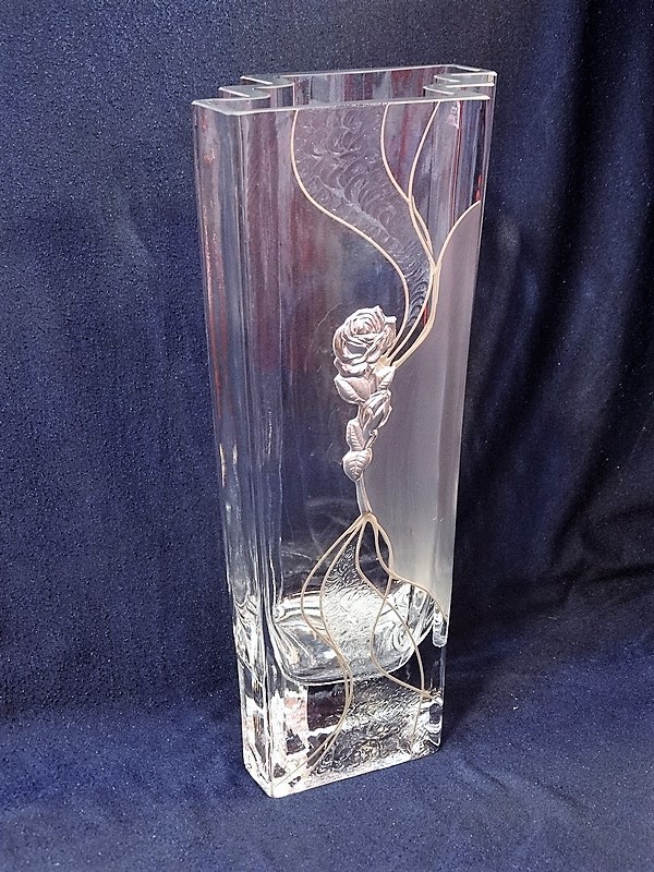 Elegancki wazon ozdobiony srebrem i metodą decoupage. Wazon zdobiony jest umieszczonym centralnie pięknym kwiatem róży.
