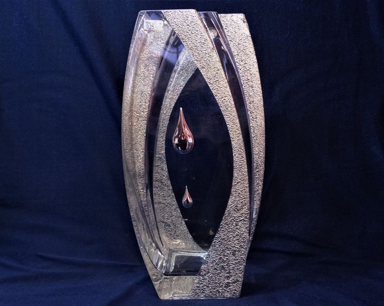 Niepowtarzalny, ręcznie formowany, zdobiony wazon szklany w obłym kształcie z bocznymi, łukowatymi, falowanymi schodkami.