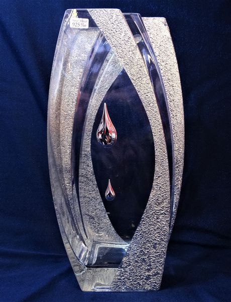 Elegancki wazon ozdobiony srebrem. Zdobienie jest z boku wazonu i przypomina pognieciony srebrny papier naklejony na szkle.