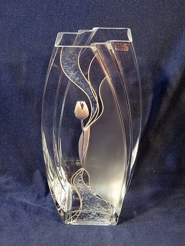 Wazon zdobiony jest umieszczonym centralnie efektownym małym tulipanem, który wygląda jak zatopiony i malowany na szkle.