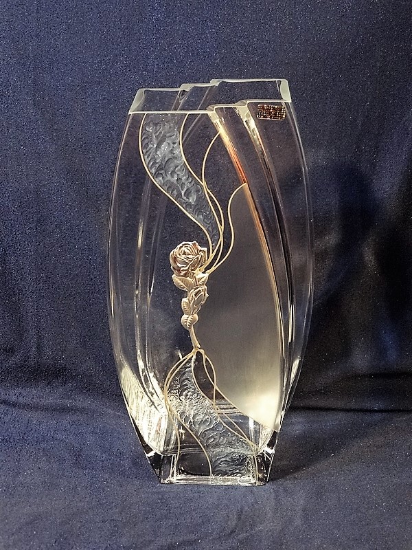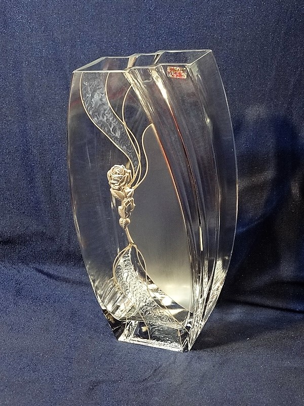 Dodatkowo w centralnej części wazonu umieszczony jest srebrny element w formie pięknego kwiatu róży.