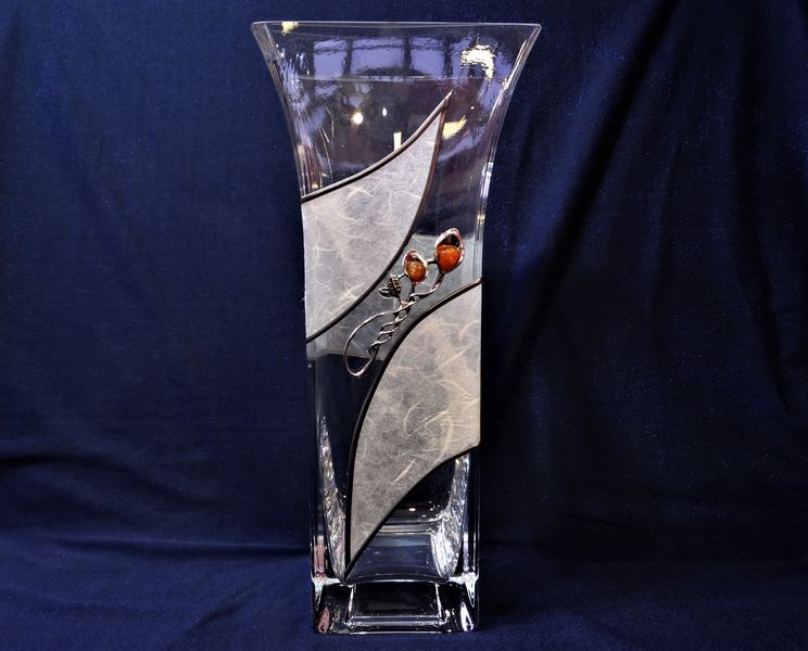Elegancki wazon zdobiony jest metodą decoupage, metaloplastyką i naturalnym minerałem.