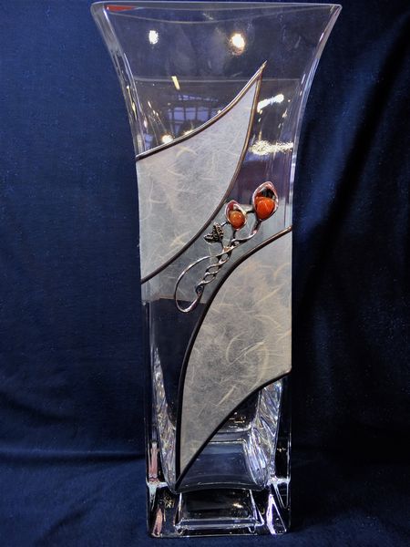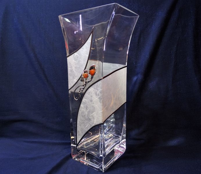 W centralnej części wazonu umieszczony jest metalowy element w formie ozdobnej broszki z kamyczkami karneol.