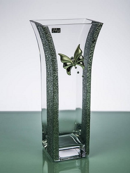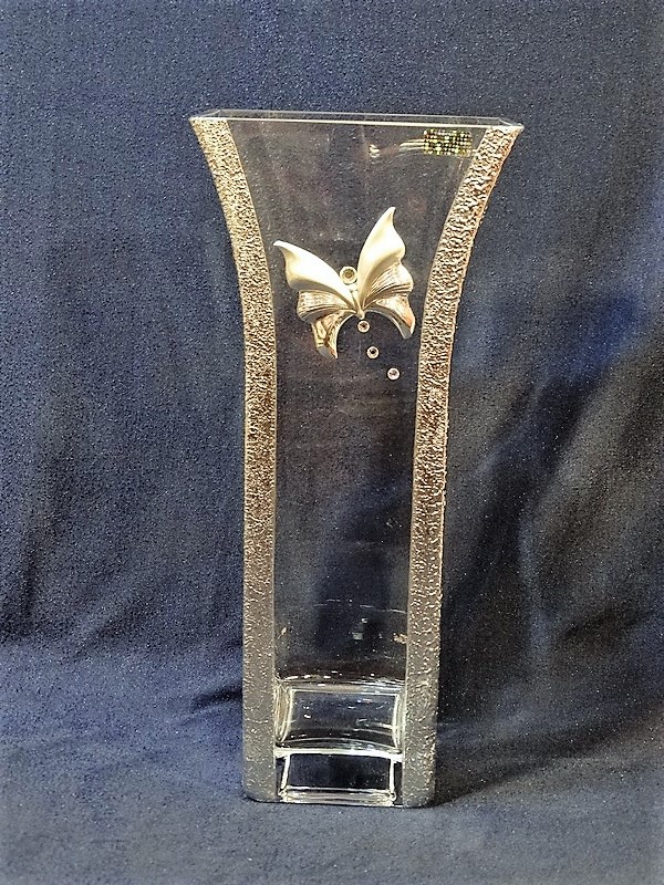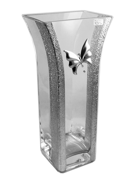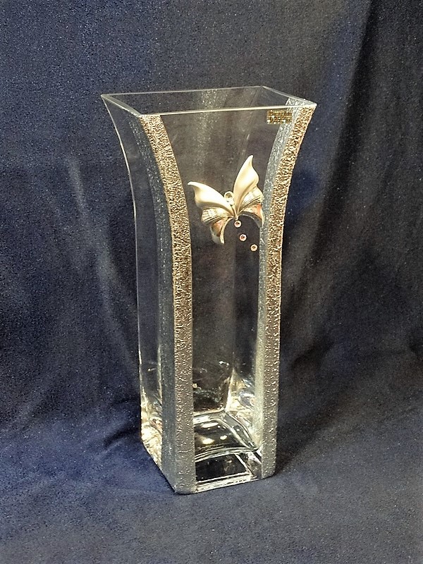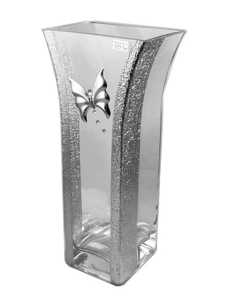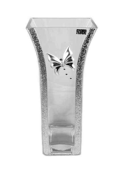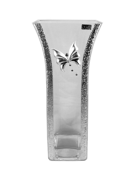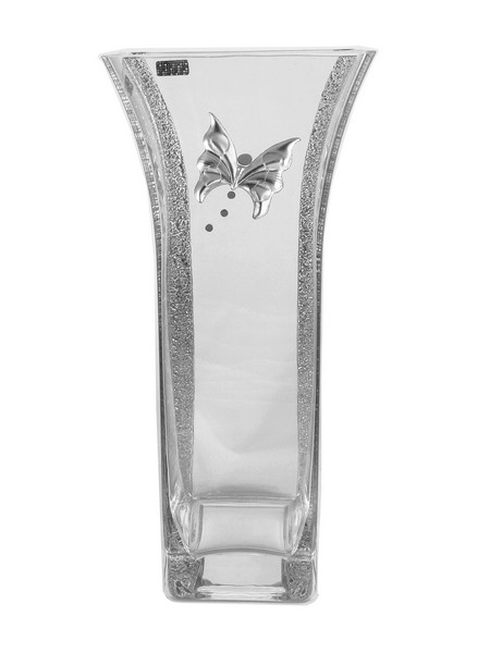 Wazon ozdobiony jest umieszczonym centralnie pięknym srebrnym motylem i kryształkami.