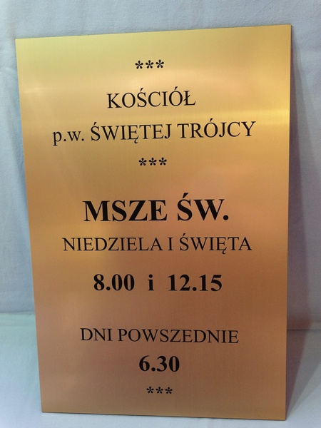 Tablica informacyjna grawerowana ze złotego laminatu w rozmiarze 30 x 45 cm.