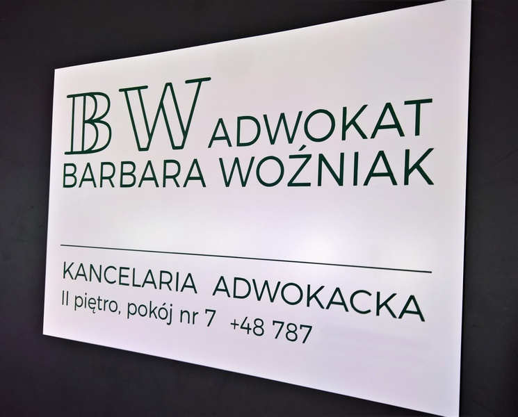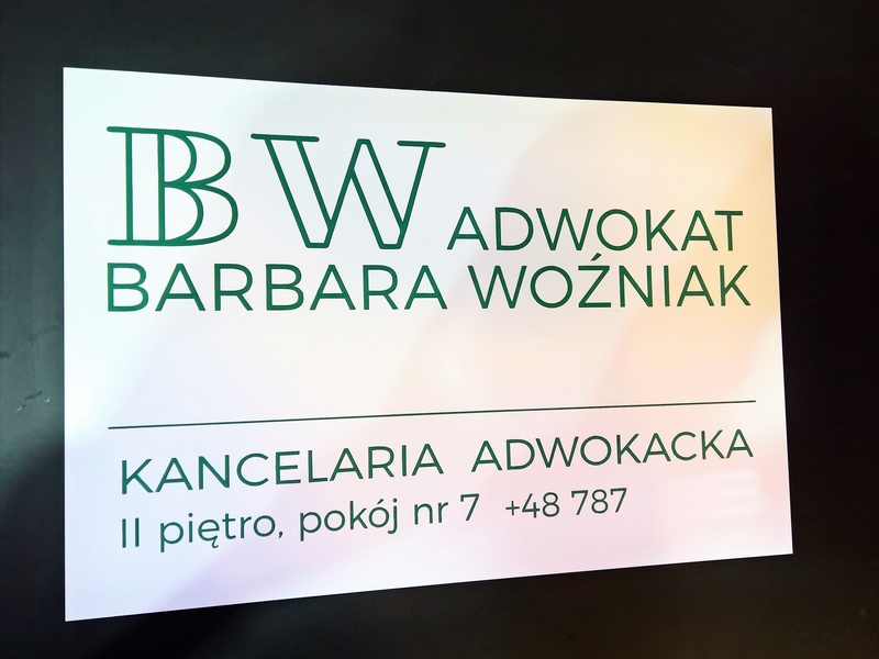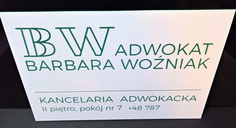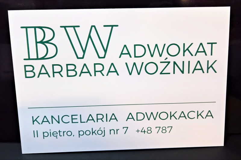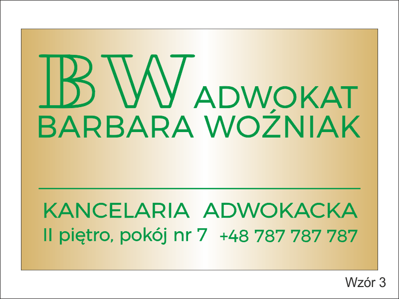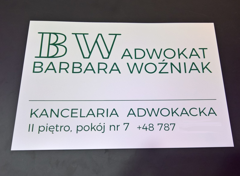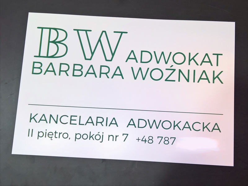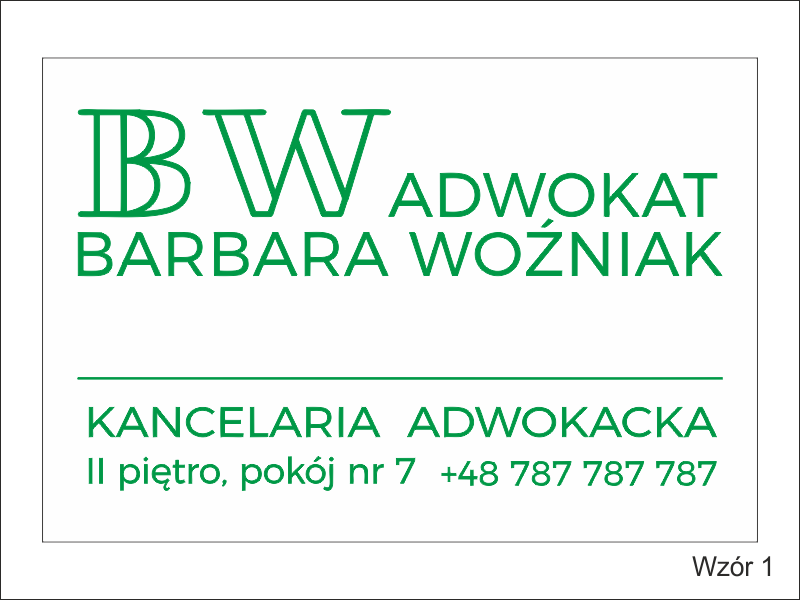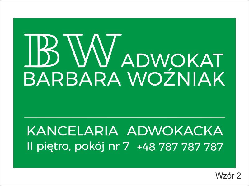 Tablica informacyjna adwokacka z biało/zielonego laminatu grawerskiego w rozmiarze 45 x 30 cm.