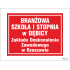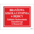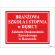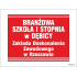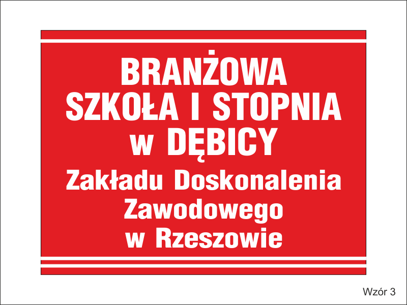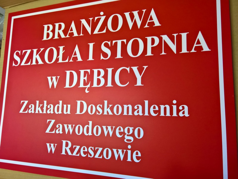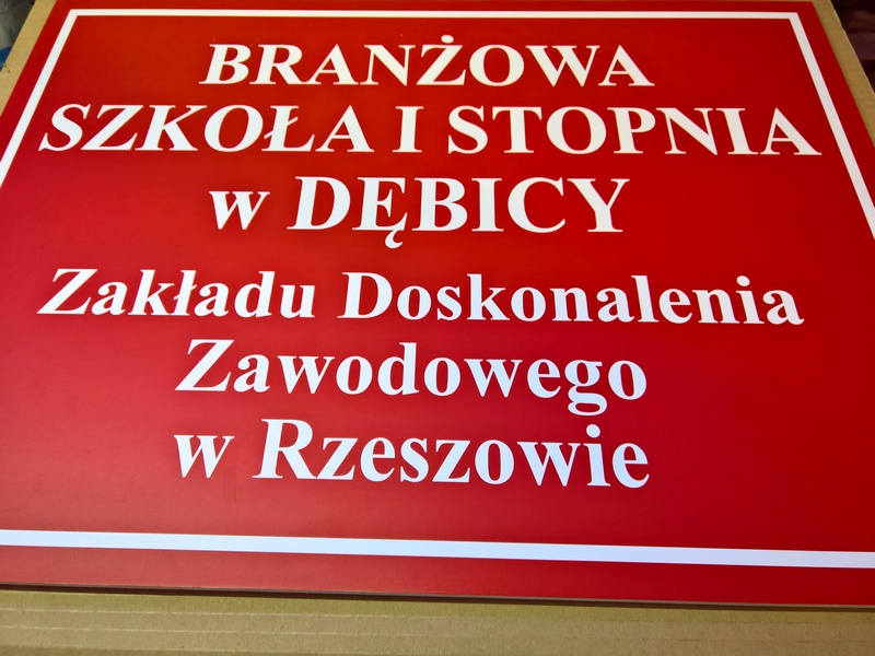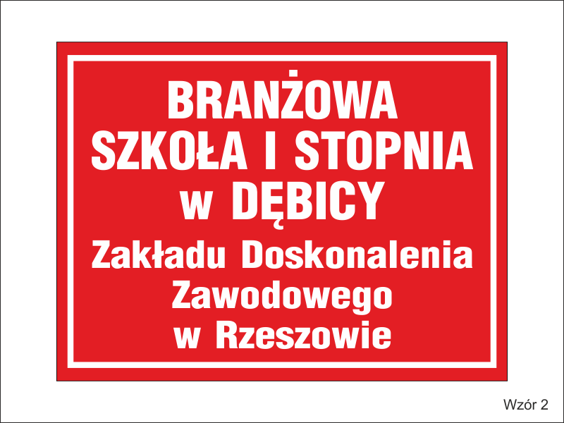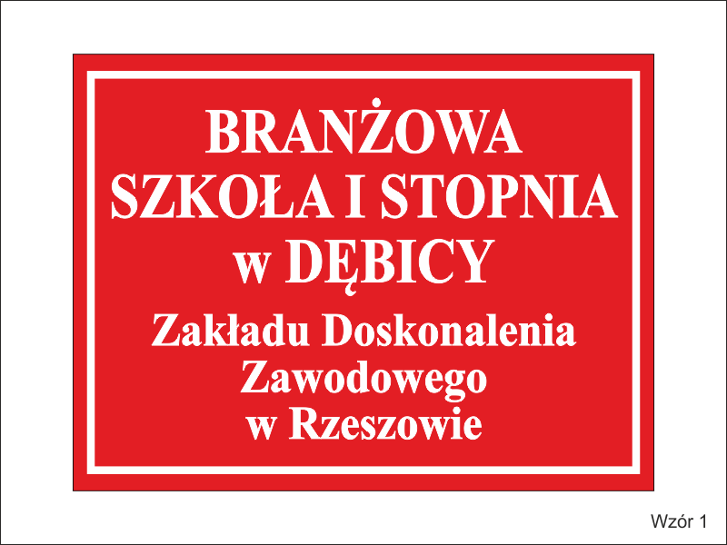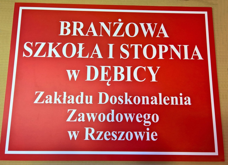Tablica informacyjna z nazwą szkoły branżowej na czerwonym tle w rozmiarze 60 x 45 cm.
