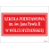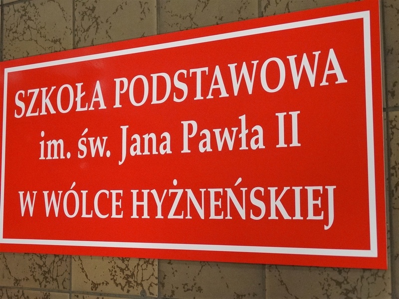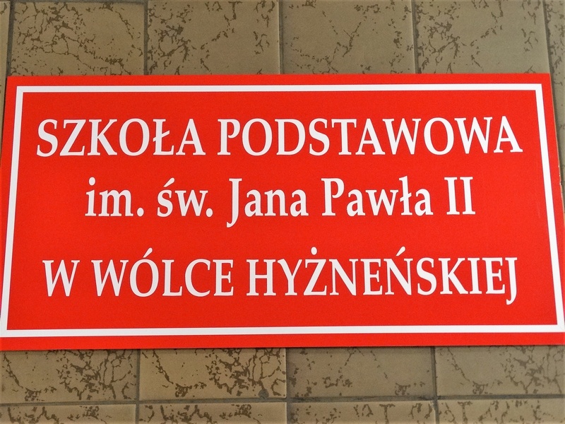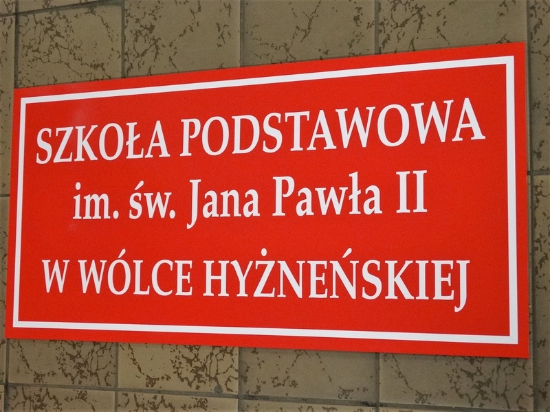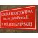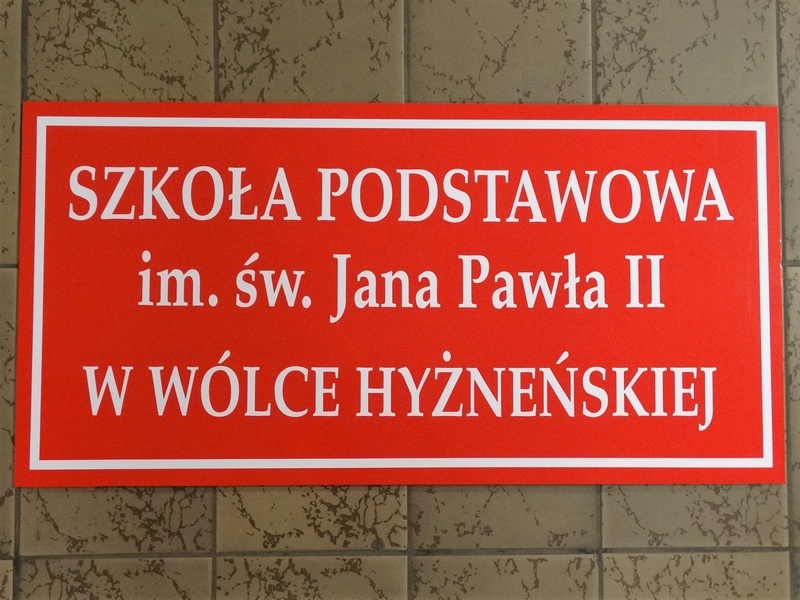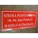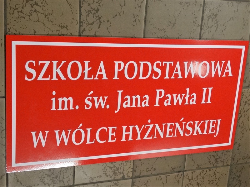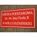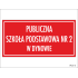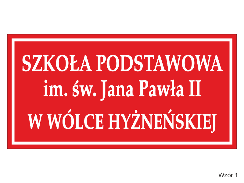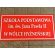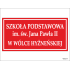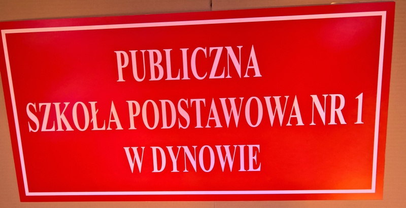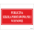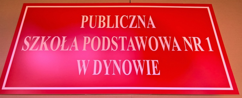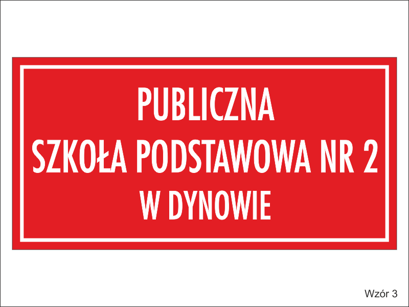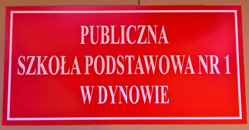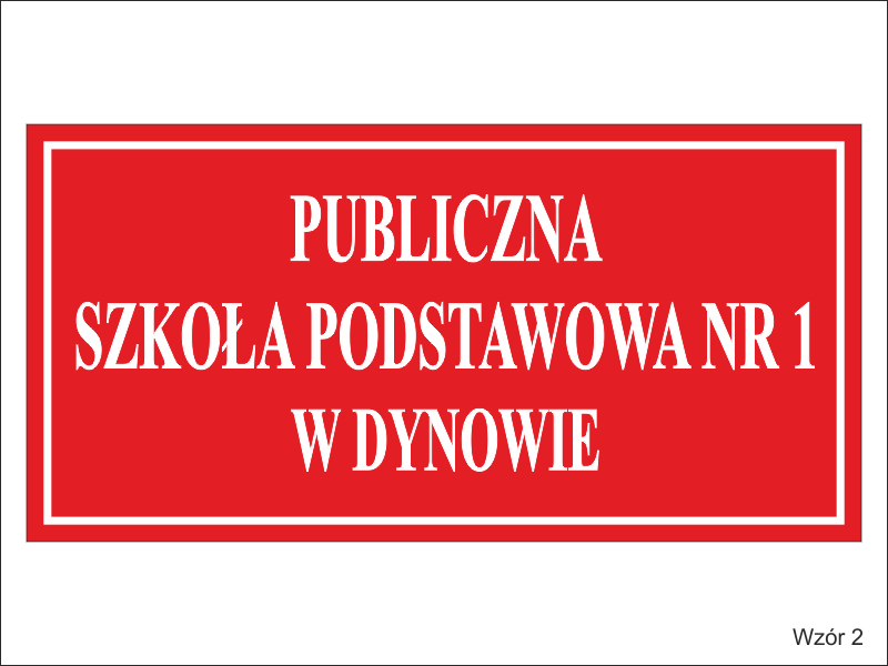 Tablica informacyjna z nazwą szkoły podstawowej na czerwonym tle w rozmiarze 80 x 40 cm.