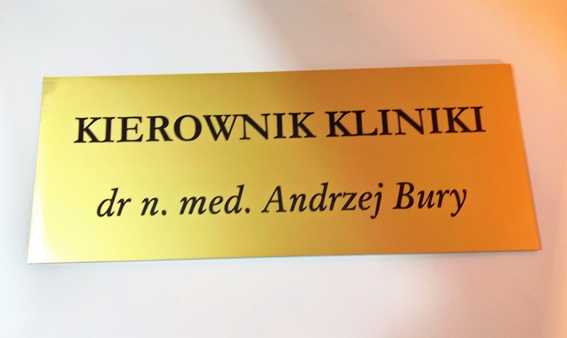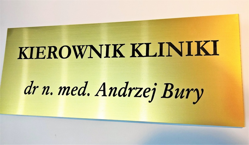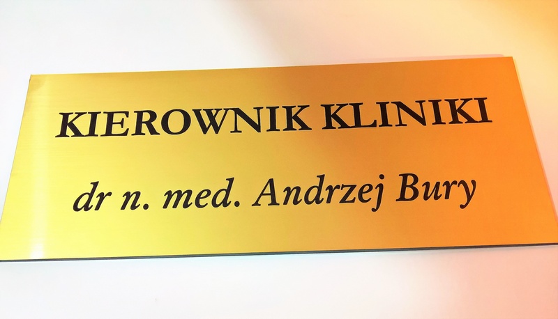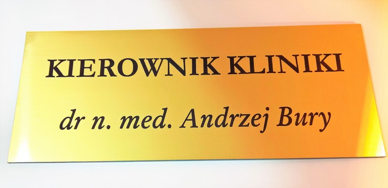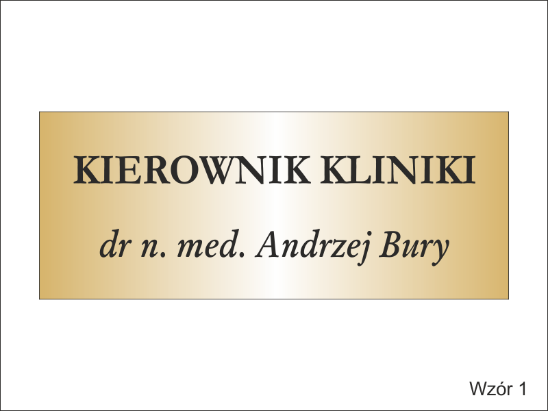 Tabliczka informacyjna nadrzwiowa z blachy aluminiowej wykończonej na złoto, w rozmiarze 25 x 10 cm.