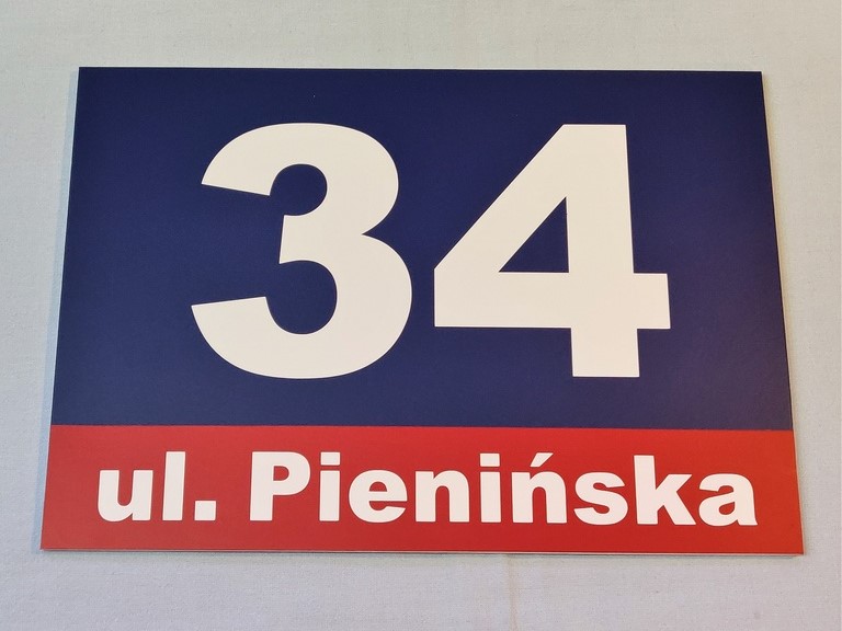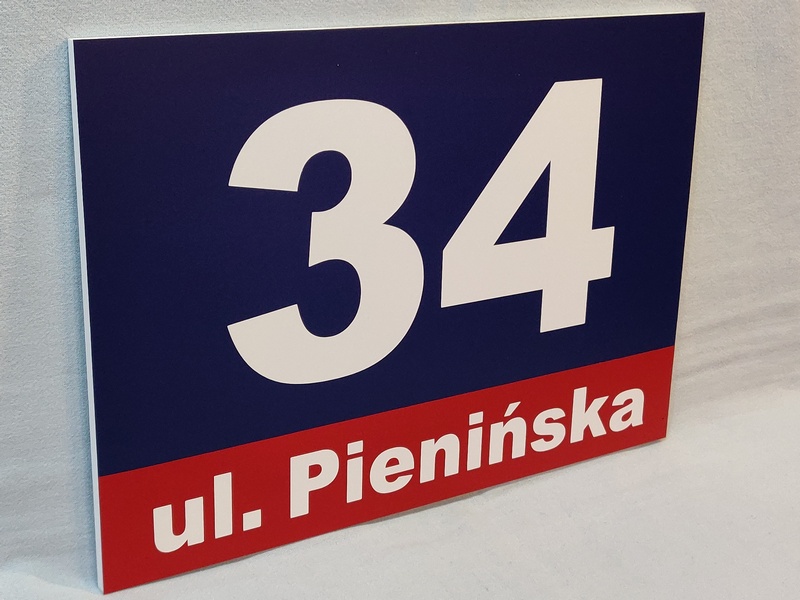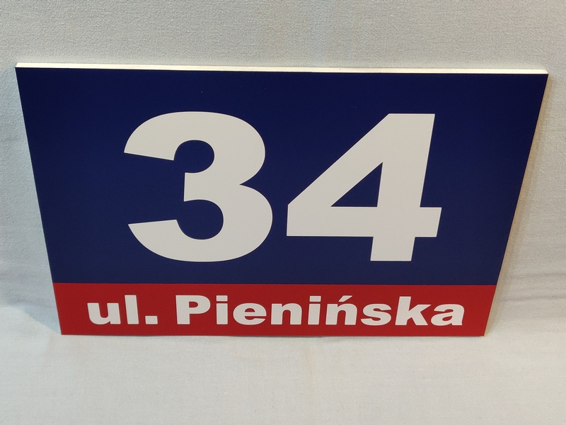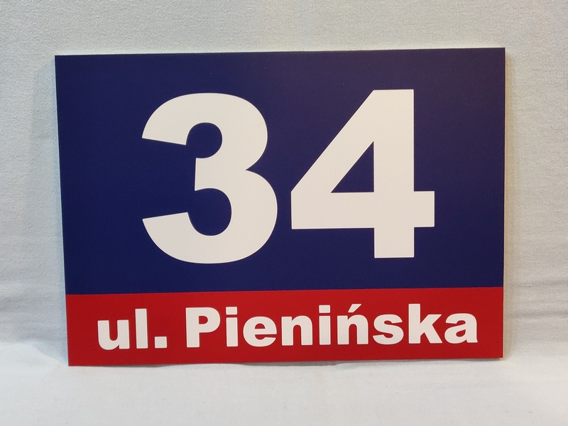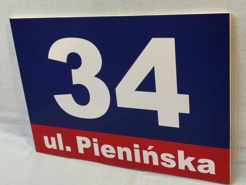 Płyta PCV ma grubość 5 mm przycięta jest na wymiar tabliczki, a z folii wyklejone jest dwukolorowe tło oraz nazwa ulicy i numer domu.