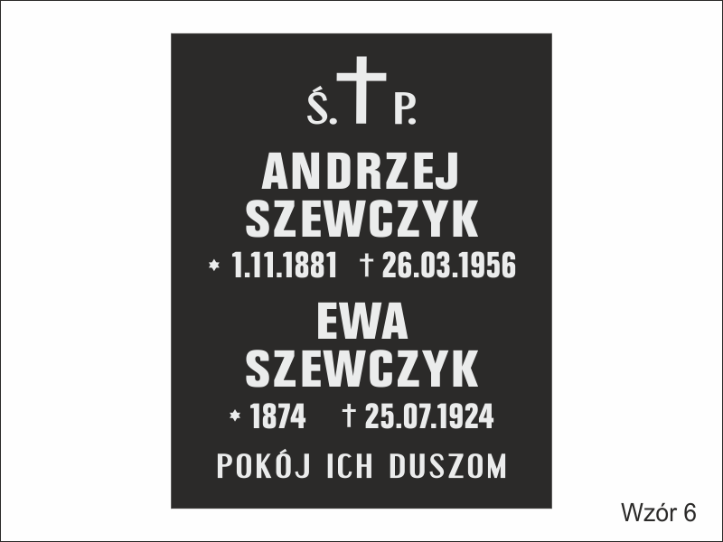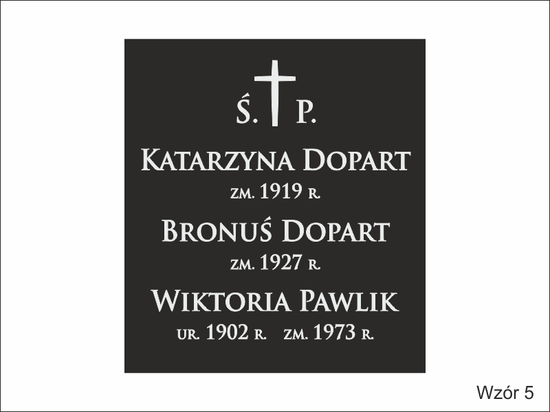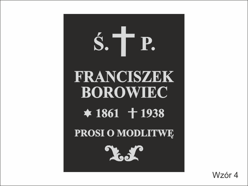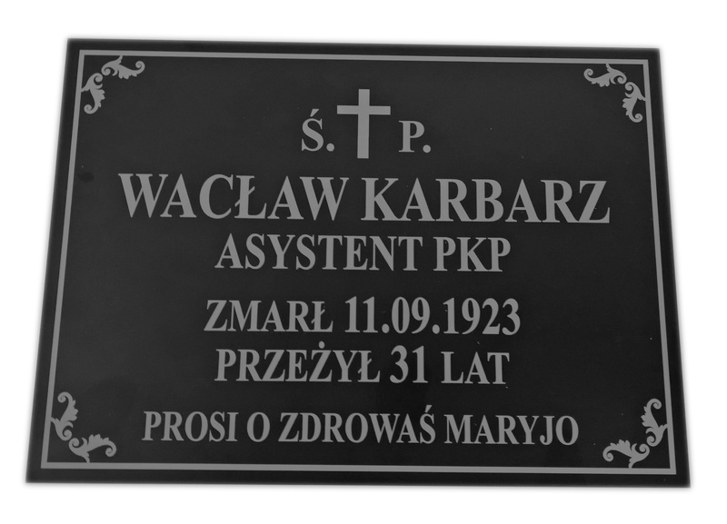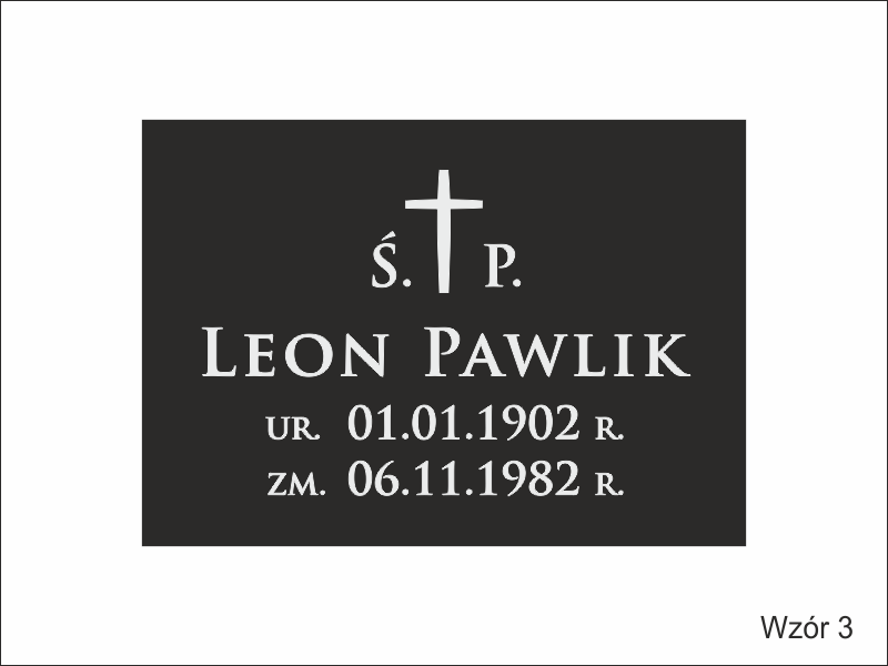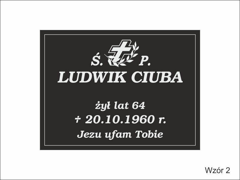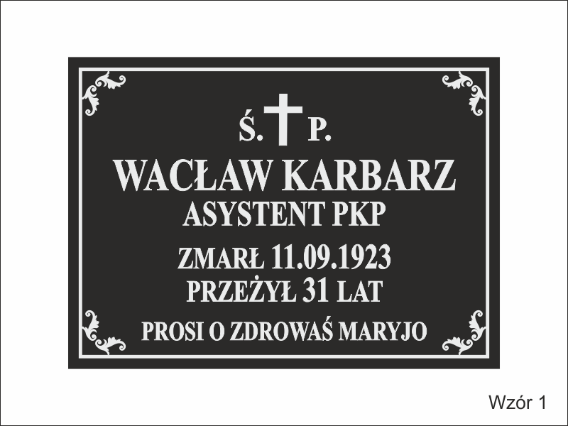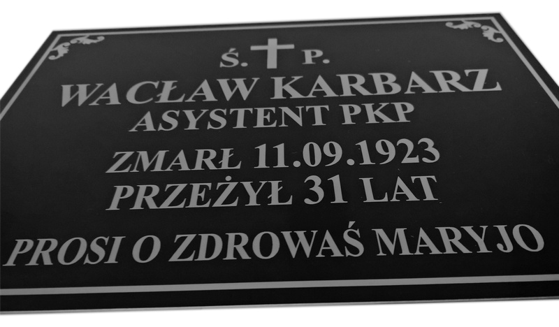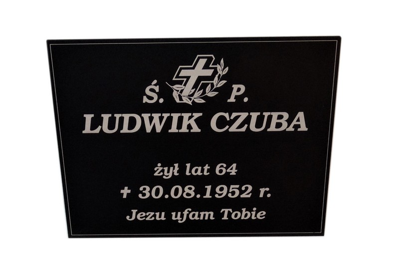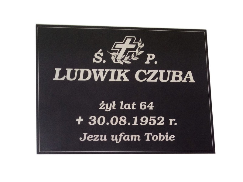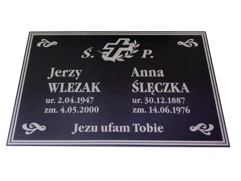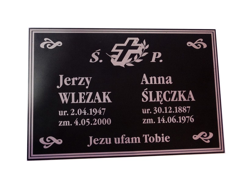 Tablica nagrobkowa grawerowana, wykonana z blachy aluminiowej anodowanej na czarno.