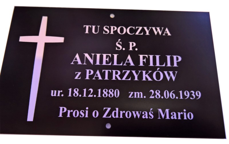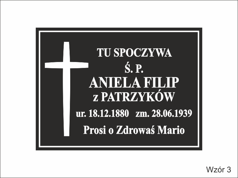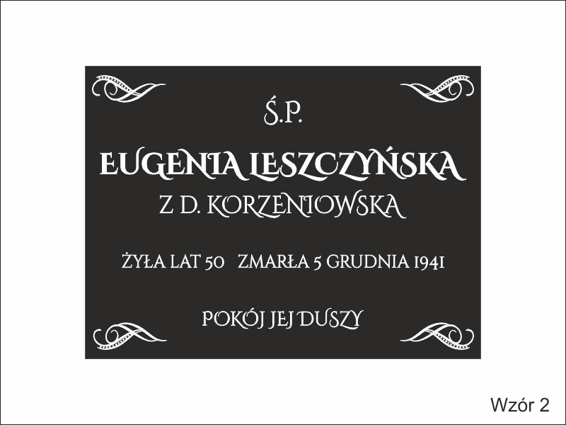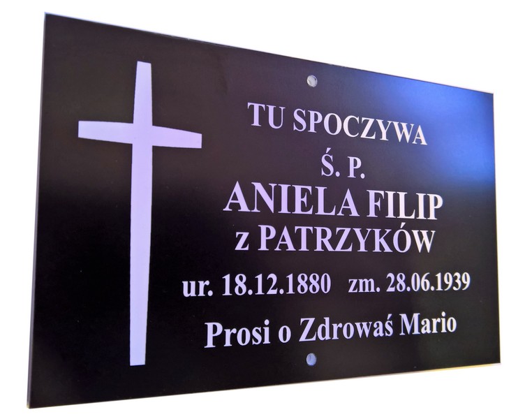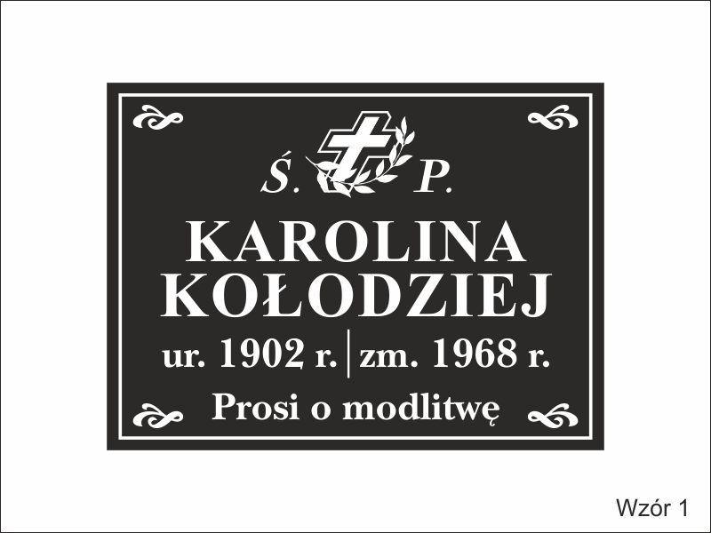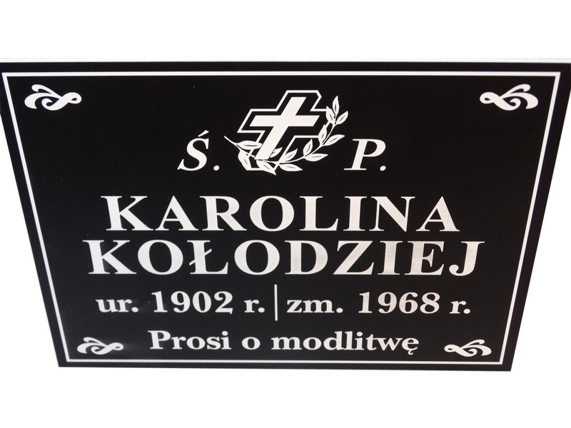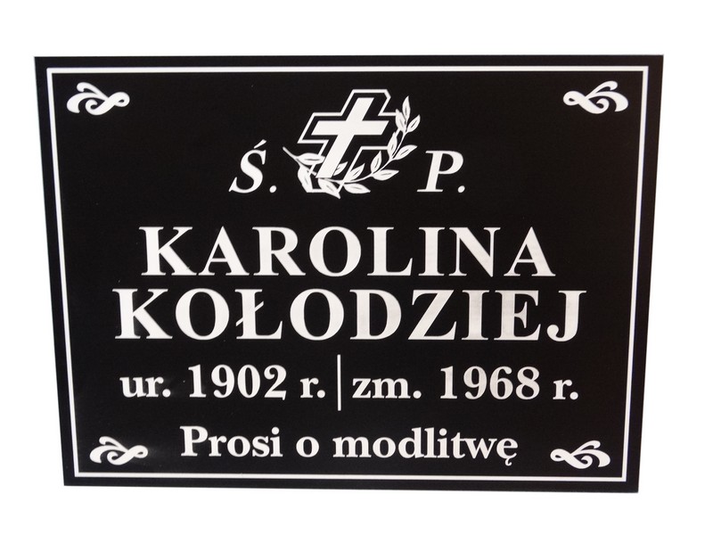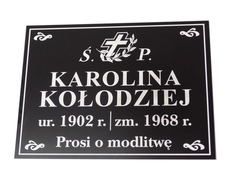 Tablica nagrobkowa prostokątna grawerowana, w układzie poziomym, wykonana z laminatu, w różnych rozmiarach.