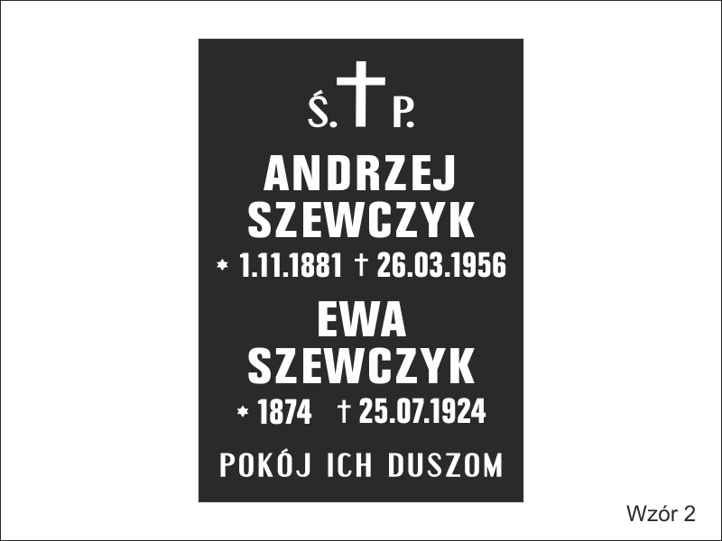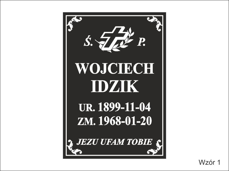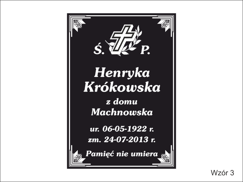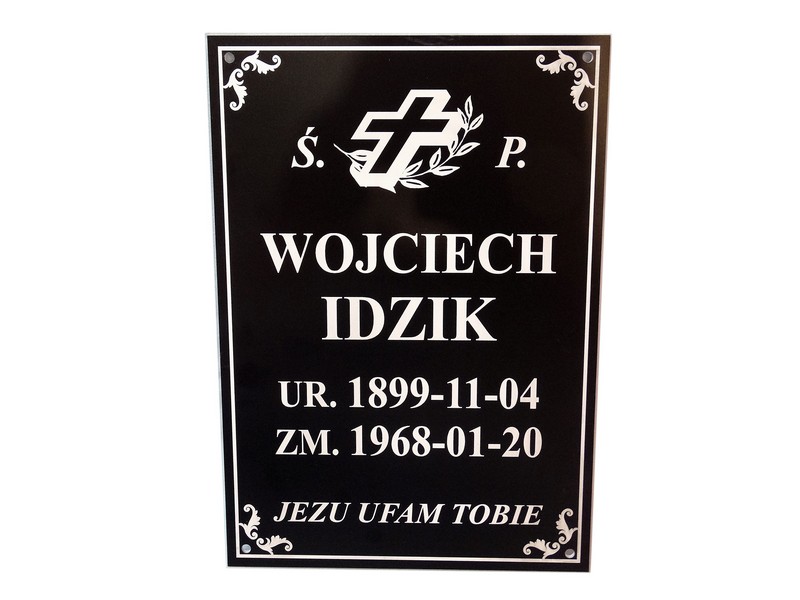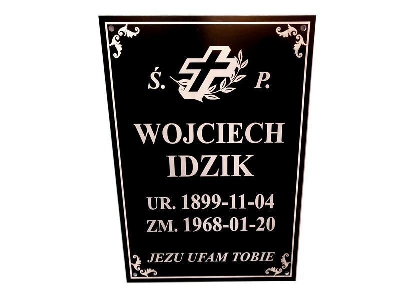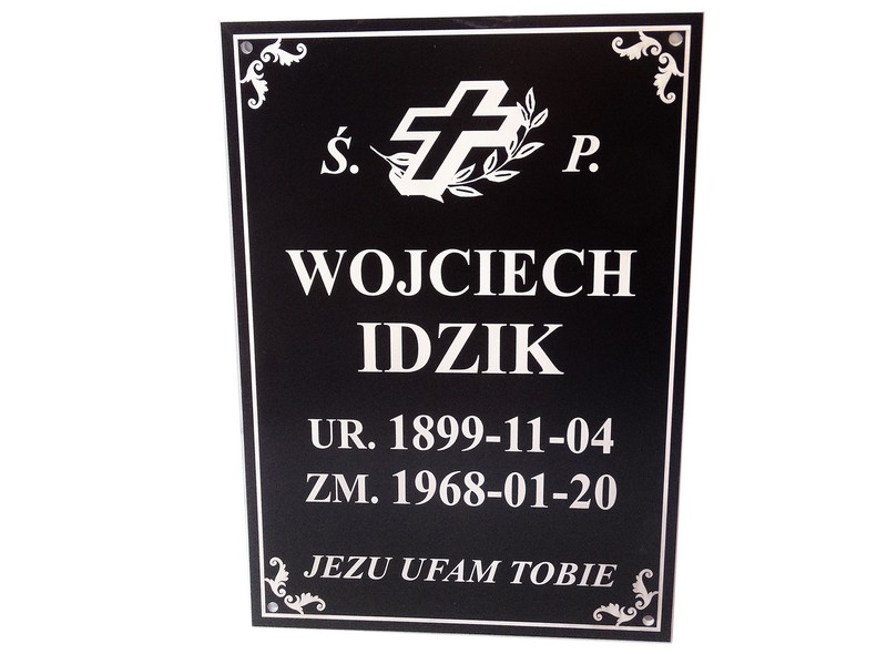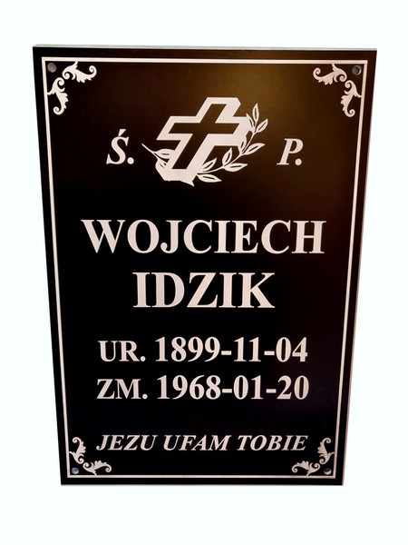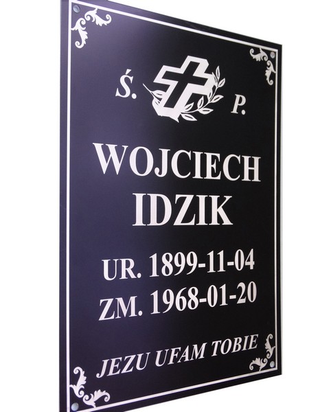 Tablica nagrobkowa prostokątna grawerowana, w układzie pionowym, wykonana z laminatu, w różnych rozmiarach.