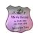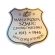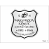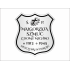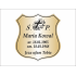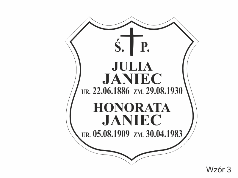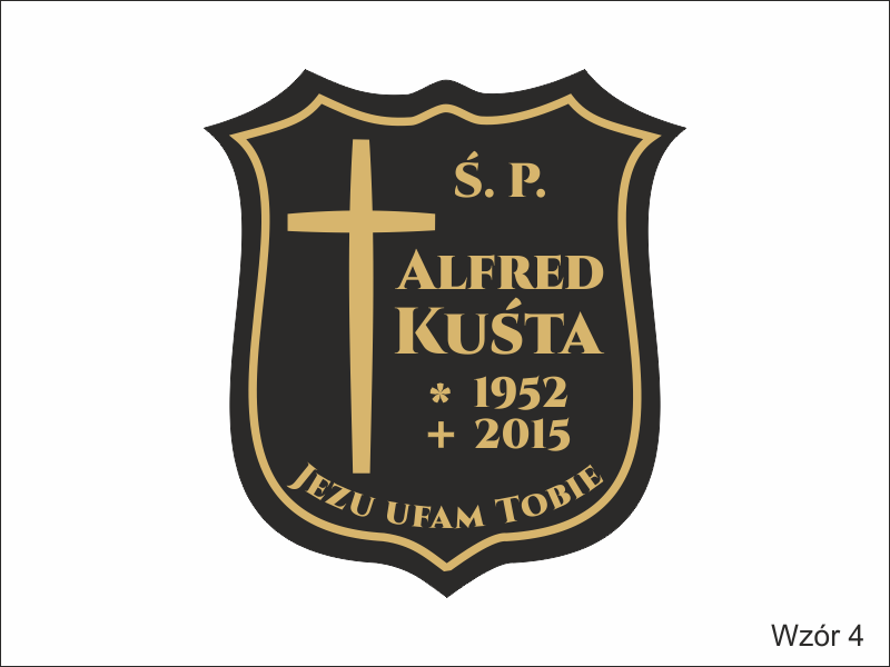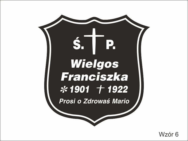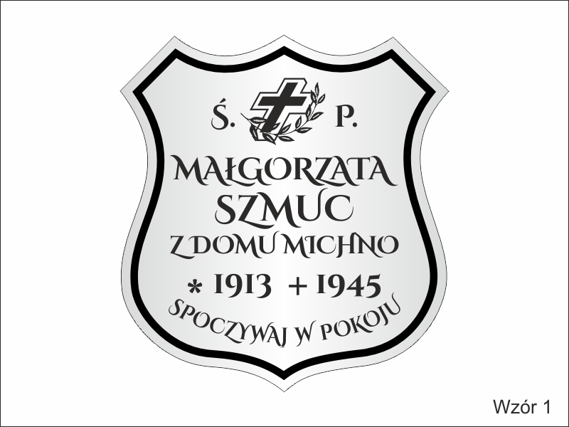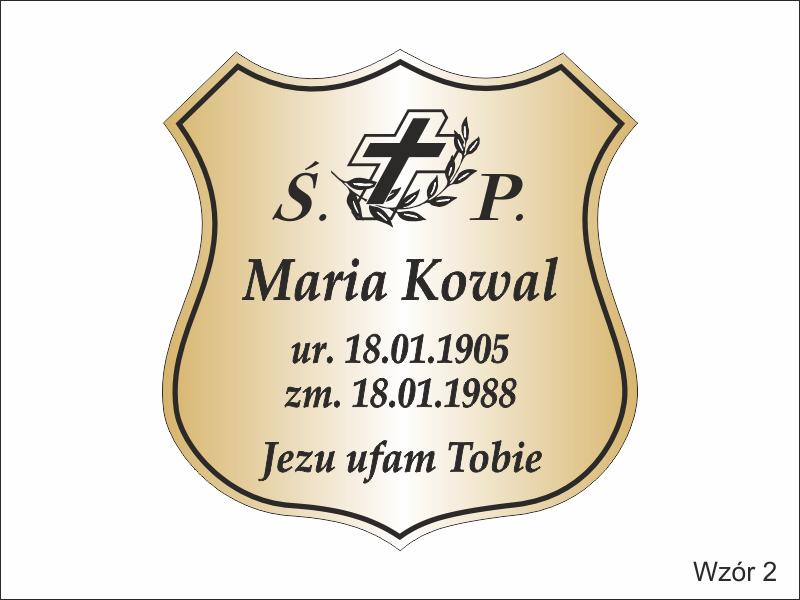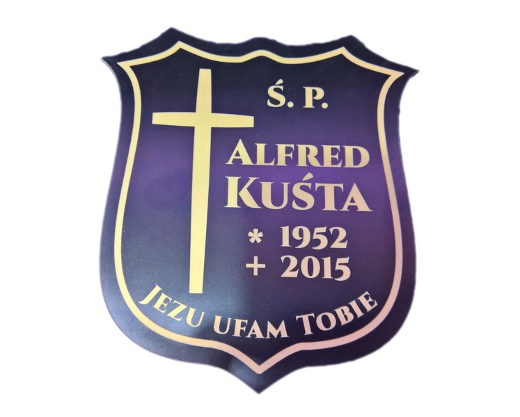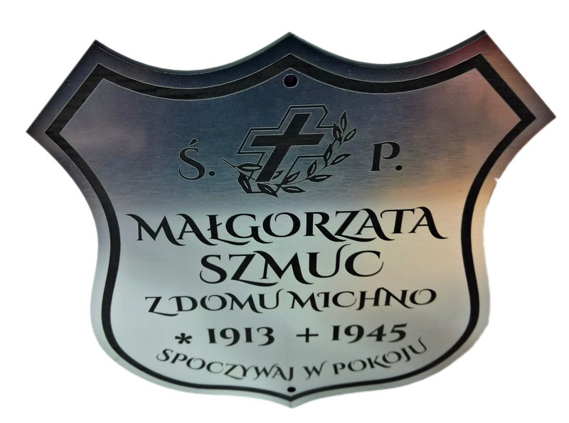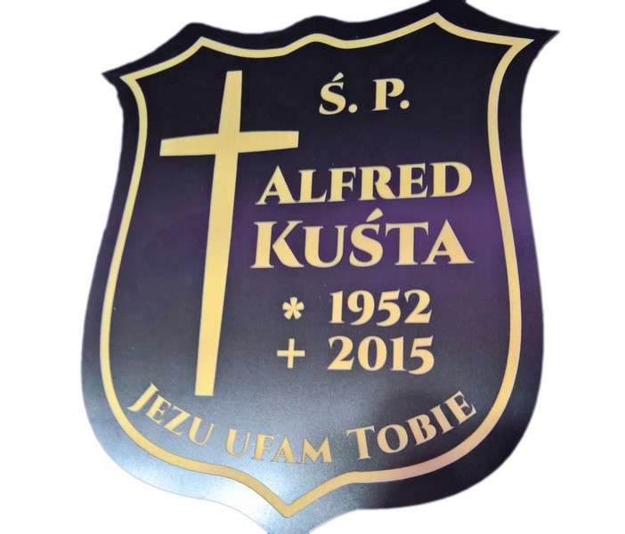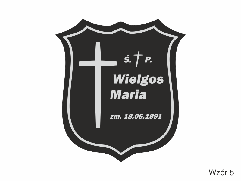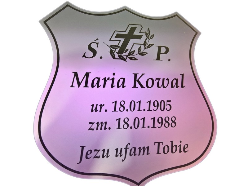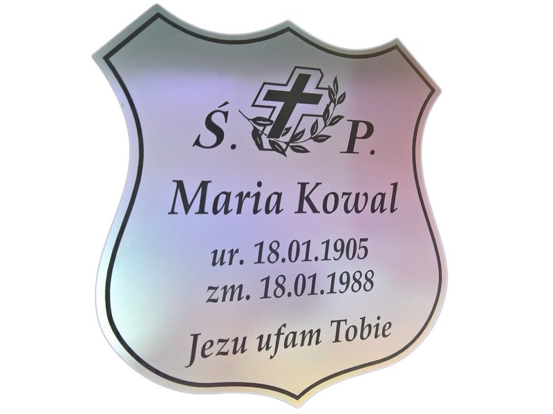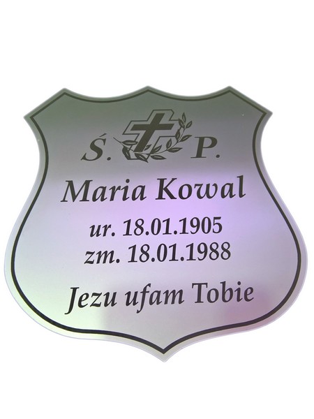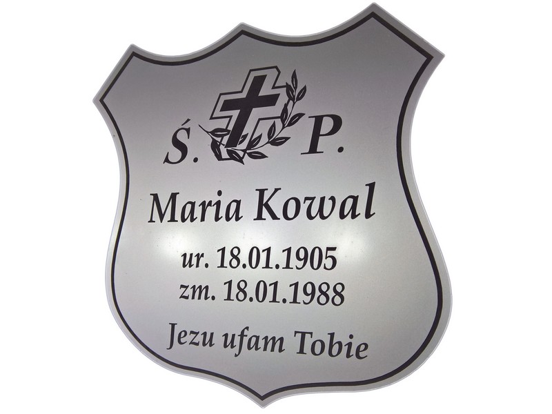 Tabliczka nagrobkowa w kształcie tarczy, wykonana z laminatu grawerskiego, w różnych rozmiarach.