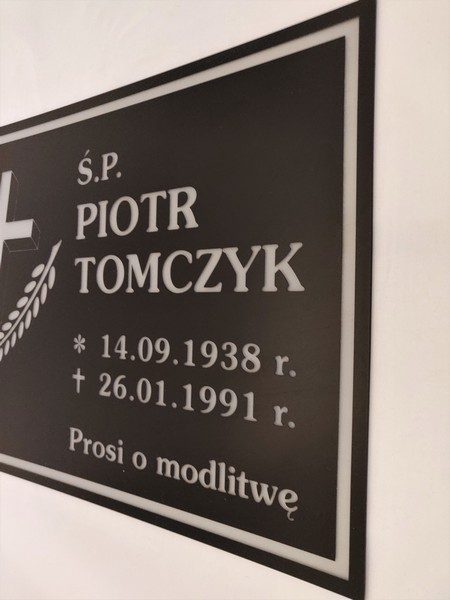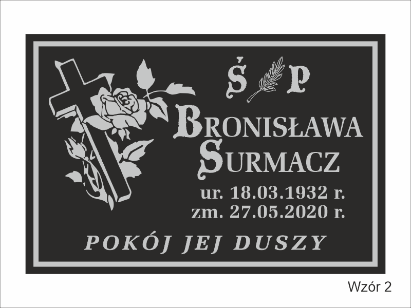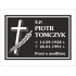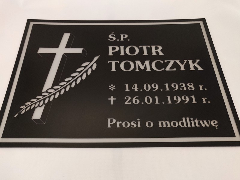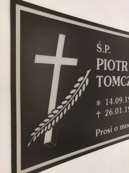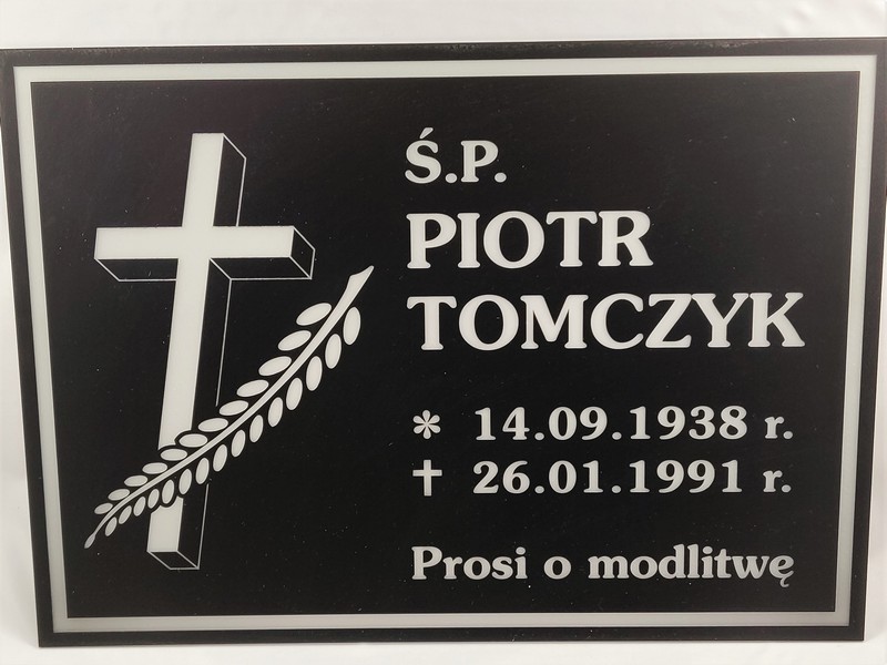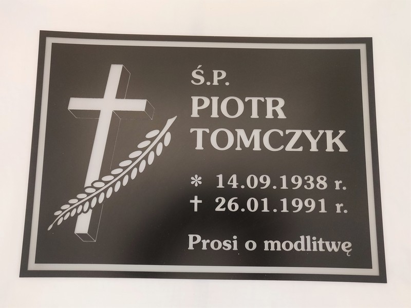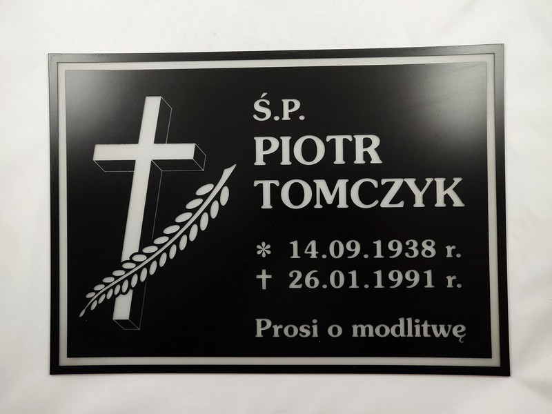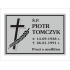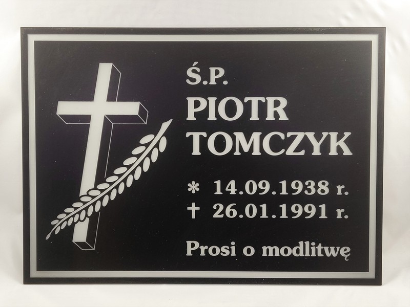 Tablica nagrobkowa grawerowana, wykonana z laminatu grawerskiego w prostokątnym kształcie.